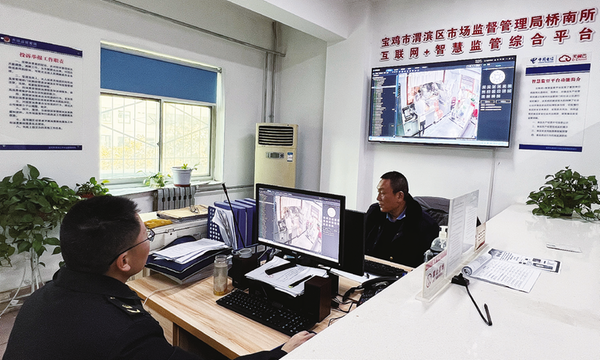 在渭濱區市場監督管理局橋南所的一體化監管綜合平臺前,筆者看到平臺正高效運行,對轄區內所有設有食堂的學校實現實時監控。當畫面切換至某小學后廚時,工作人員規范有序的操作清晰可見。調度平臺工作人員不僅可以通過屏幕隨時開展遠程巡查,還能借助語音設備進行實時喊話,對發現的違規行為及時做出糾正。