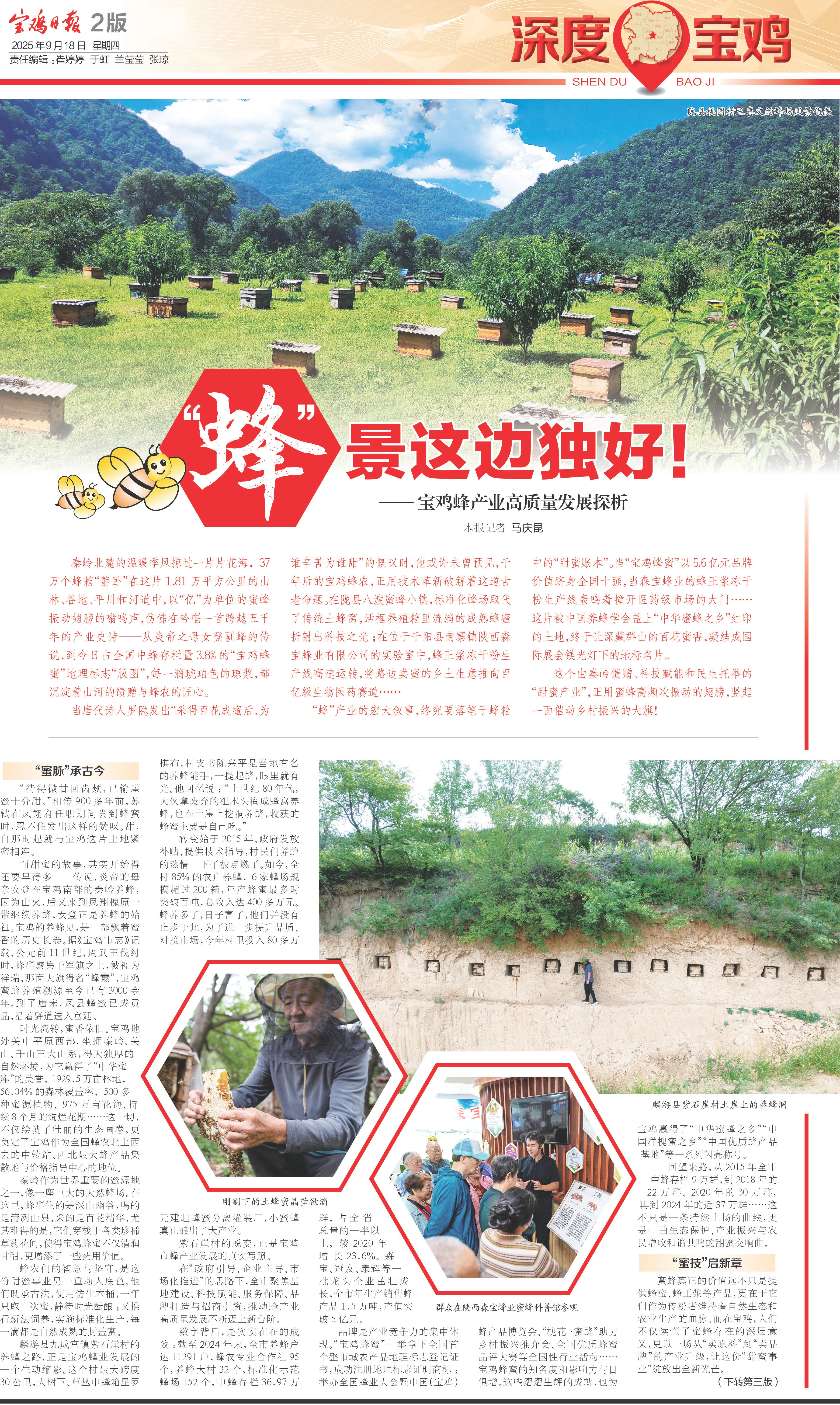 從《蜂王漿凍干粉飲片規范》的制定者,到全國首條GMP藥用蜂蜜生產線開創者,寶雞人以秦嶺為硯、蜂翼為筆,在質量興蜂的答卷上揮毫作答。這答卷上寫著——每一滴蜂蜜都是生態承諾,每一箱蜂群都是民生基石,蜜蜂每一次振翅都是產業融合的強音!