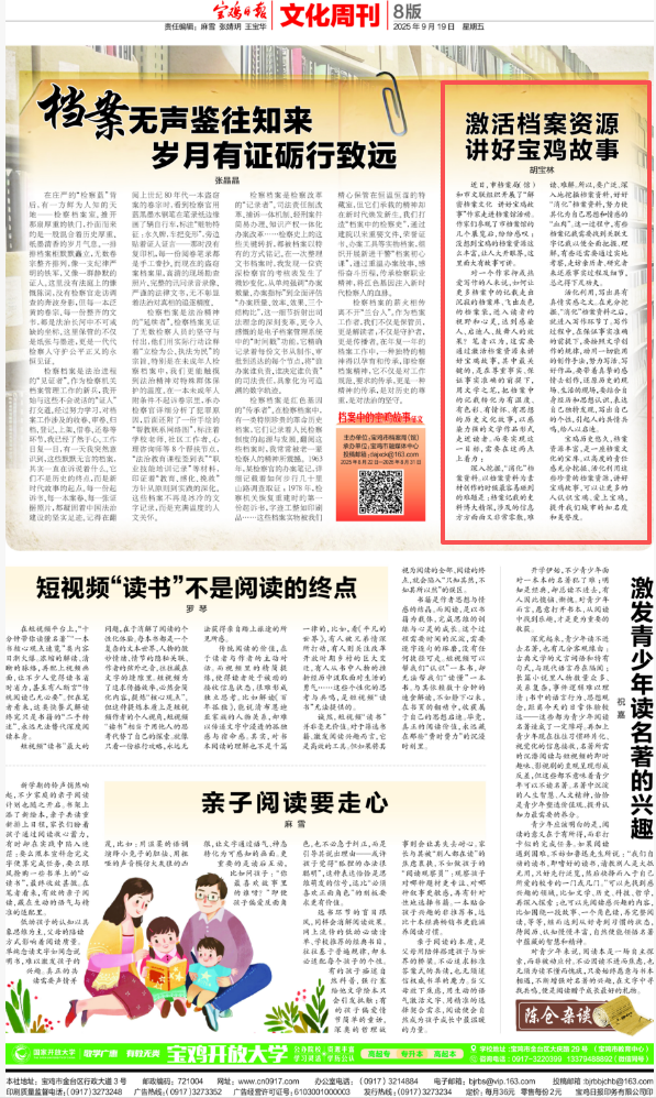 寶雞歷史悠久,檔案資源豐富,是一座檔案文化的寶庫。以高度的責任感充分挖掘、活化利用這些珍貴的檔案資源,講好寶雞故事,可以讓更多的人認識寶雞、愛上寶雞,提升我們城市的知名度和美譽度。