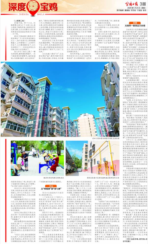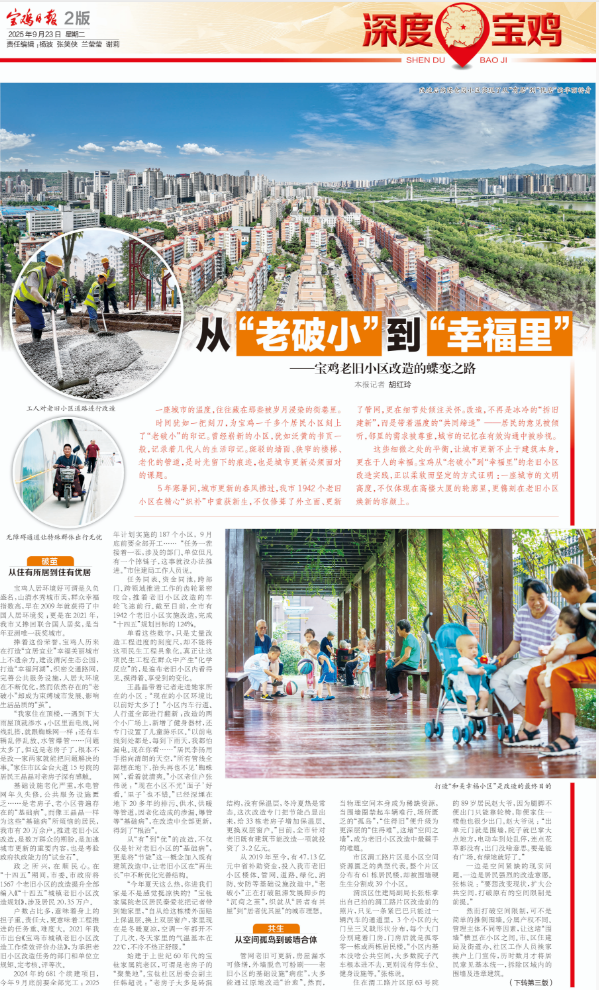 從“老破小”到“幸福里”的華麗變身,不僅是城市容顏的“一鍵美顏”,更是居民生活的“幸福加倍”。我們期待寶雞在改造中愈加美好,在更新中愈顯活力。寶雞的舊改故事,從來不是一場與過去的決裂,而是將斑駁的歲月織入嶄新的經(jīng)緯。當(dāng)1942個老舊小區(qū)在精心“織補(bǔ)”中重獲新生,整座城市都在踐行著一個樸素的道理——讓記憶有處棲居,讓愿景觸手可及,讓幸福直抵千家萬戶。