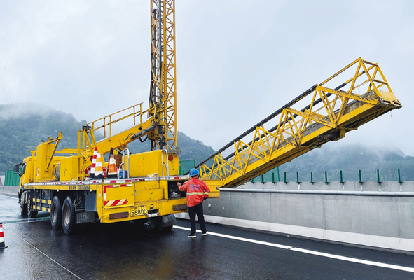 在馬耳山石頭河特大橋上,記者看到作業人員操作橋梁檢測作業車在對橋體做最后的安全檢查。據介紹,該橋全長1521米,是陜西省高速公路首次應用50米箱梁結構的橋梁。目前,橋梁已進入檢測及標識標線施劃階段,為全線順利通車打下堅實基礎。