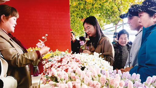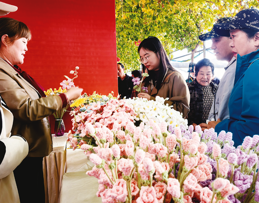 拿著毛線花細細端詳的市民蔣女士不禁感嘆,這些花朵顏色、形態都非常逼真,她要多買幾支回家插花瓶里。“編織這些花朵的門檻并不高,只需簡單培訓,就能讓居家婦女既能照顧家,又能編織出小巧精美的織物貼補家用,人均月工資1000元左右。”營子頭村黨支部書記嚴利勤介紹,此次展銷不僅展示了鄉村振興成果,更讓傳統手藝煥發新生機,為村民鋪就了一條“指尖上的致富路”。