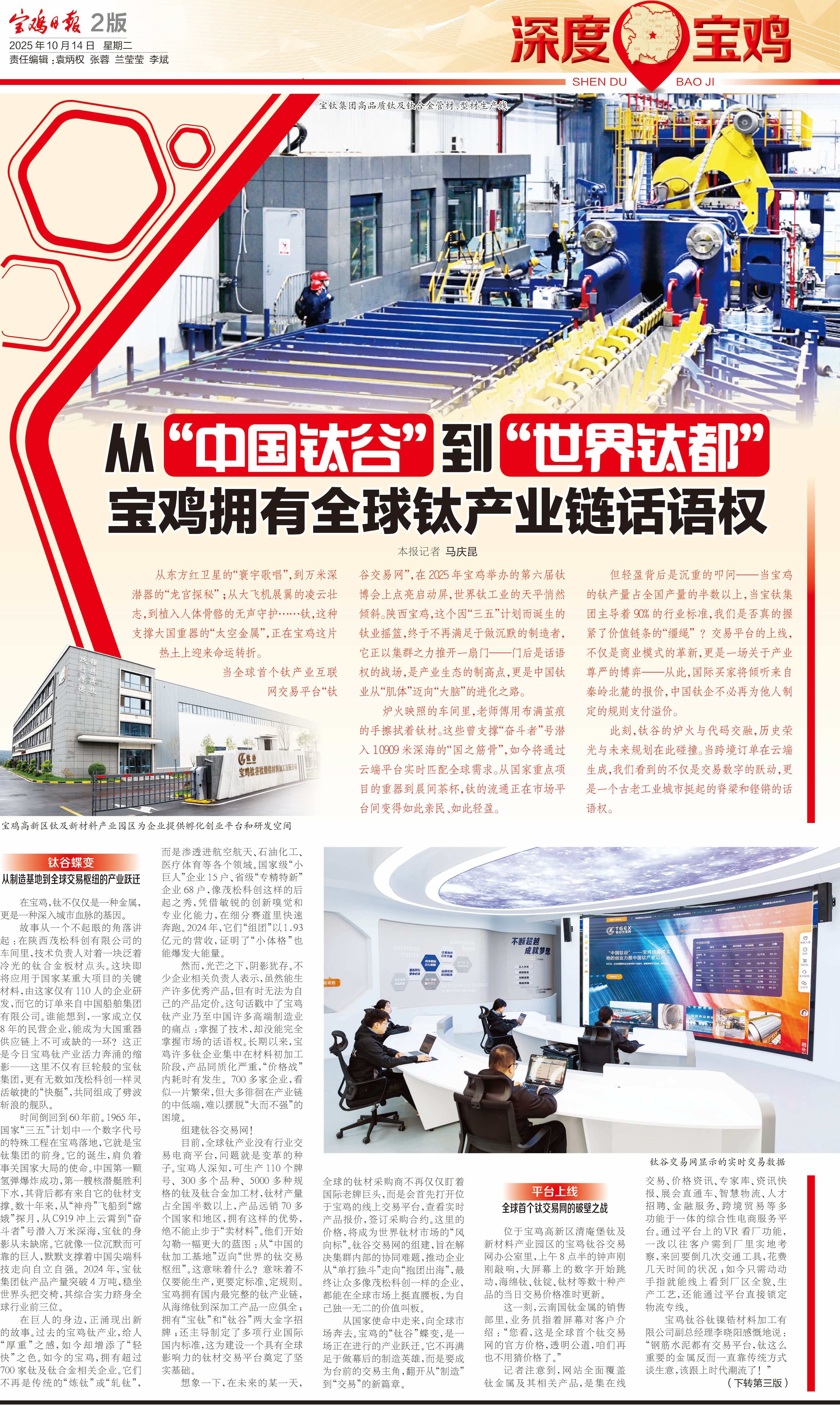從國家使命中走來,向全球市場奔去。寶雞的“鈦谷”蝶變,是一場正在進行的產業躍遷。它不再滿足于做幕后的制造英雄,而是要成為臺前的交易主角,翻開從“制造”到“交易”的新篇章。
