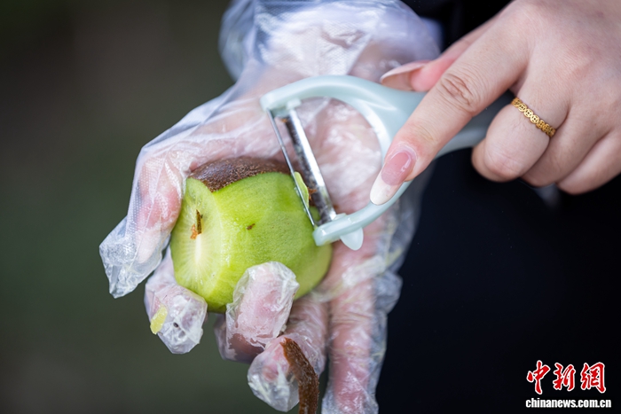 園區工作人員展示獼猴桃。中新網記者 劉星晨 攝