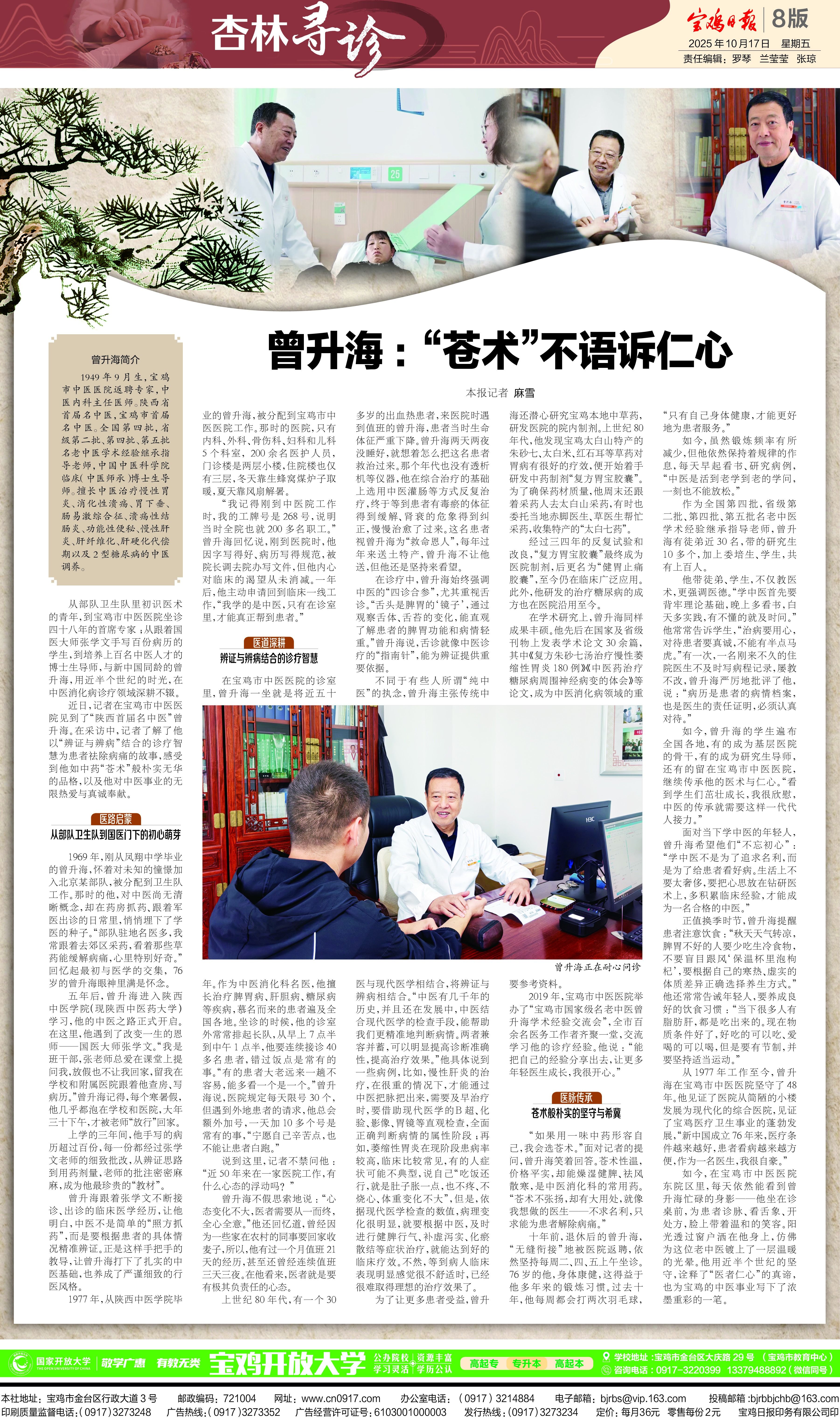 近日,記者在寶雞市中醫醫院見到了“陜西首屆名中醫”曾升海。在采訪中,記者了解了他以“辨證與辨病”結合的診療智慧為患者祛除病痛的故事,感受到他如中藥“蒼術”般樸實無華的品格,以及他對中醫事業的無限熱愛與真誠奉獻。