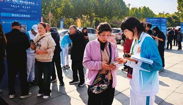 本屆展會前,連綿的秋雨使得氣溫下降,但在展會信息注冊處,志愿者們仍舊冒雨堅守,耐心地輔導每一位前來參觀的群眾完成信息注冊。在這來來往往的人群中,志愿者許可思怡在雨中為七旬老人調試手機的畫面被鏡頭定格。“爺爺您看,這樣操作就能生成酒展會入場碼?!彼贿吥托闹v解,一邊用紙巾為老人擦拭被雨水打濕的手機。