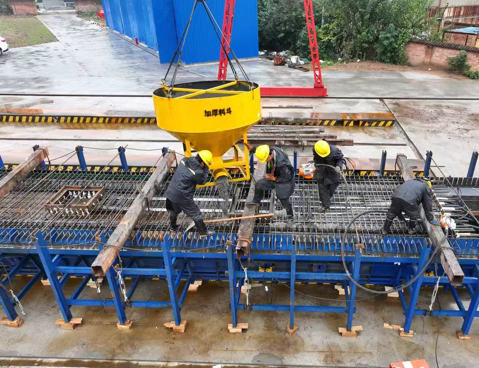 本次澆筑的預制箱梁長25米,底寬1.0米,頂寬2.2米,高1.4米。為確保首片預制箱梁順利施工,項目團隊精心組織、超前謀劃,編制了科學可行的首件工程施工方案,并嚴格落實技術交底和過程管控。施工過程中,項目部堅持精細化管理,嚴控每一道工序,從原材料質量、安全防護到技術保障等方面全面把關,并安排專人全程旁站監督,確保施工全過程安全可控、質量達標。