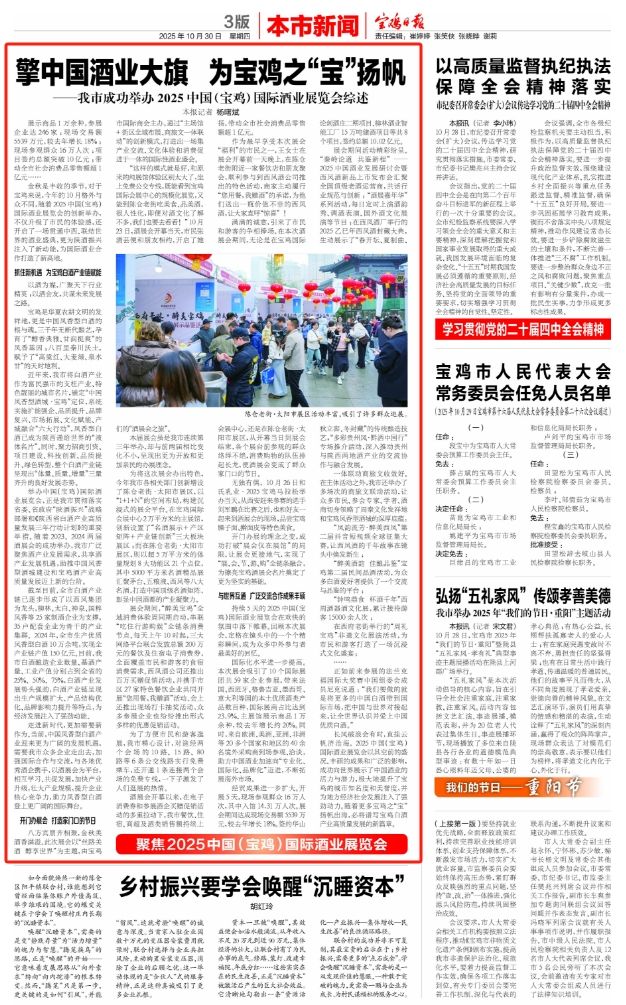 長風破浪會有時,直掛云帆濟滄海。2025中國(寶雞)國際酒業展覽會以其空前的盛況、豐碩的成果和廣泛的影響,成功向世界展示了中國酒業的活力與潛力,極大地提升了寶雞的城市知名度和美譽度,并為地方經濟社會發展注入了強勁動力。隨著更多寶雞之“寶”揚帆出海,必將譜寫寶雞白酒產業高質量發展的新篇章。(寶雞融媒 楊曙斌)