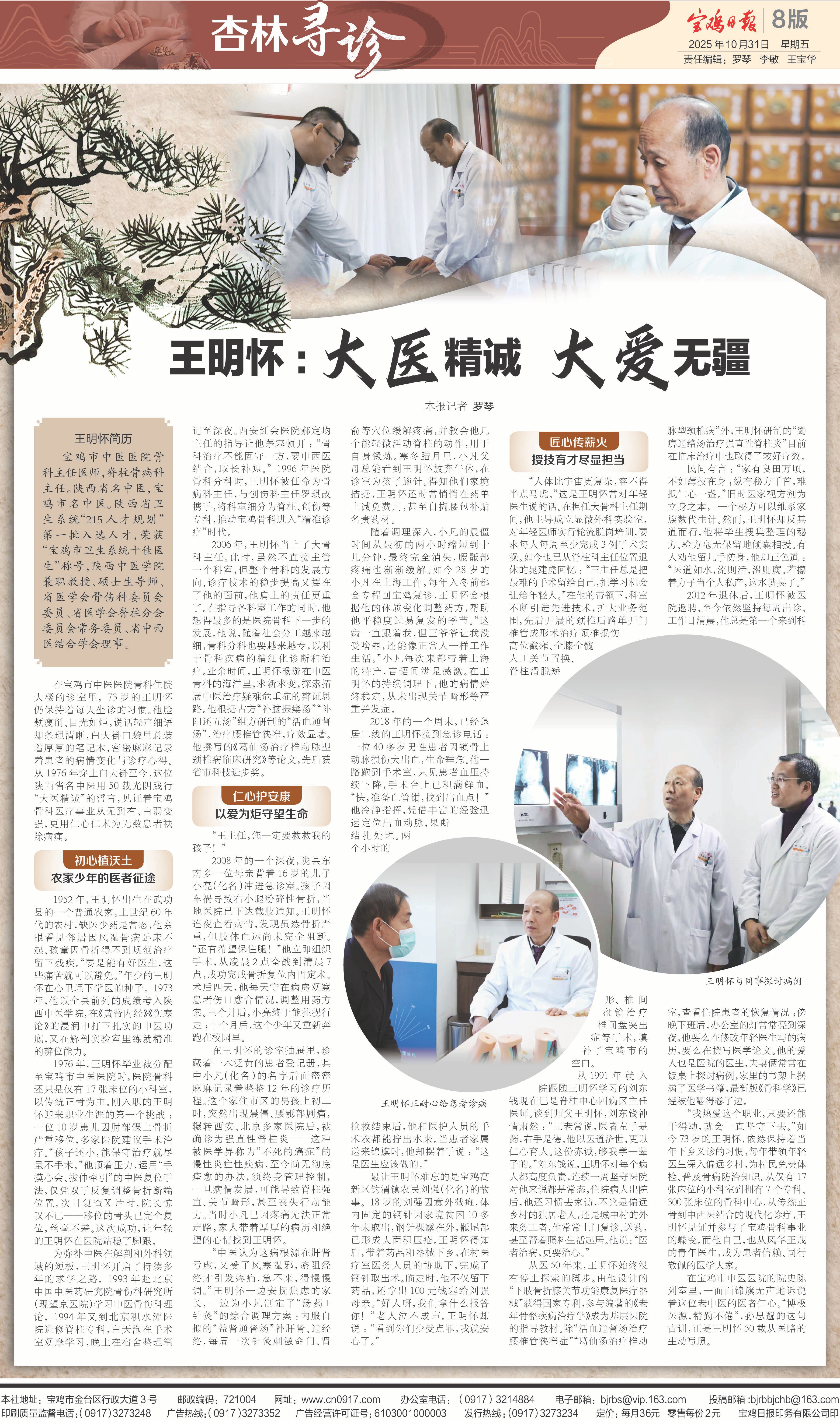 “我熱愛這個職業,只要還能干得動,就會一直堅守下去。”如今73歲的王明懷,依然保持著當年下鄉義診的習慣,每年帶領年輕醫生深入偏遠鄉村,為村民免費體檢、普及骨病防治知識。從僅有17張床位的小科室到擁有7個專科、300張床位的骨科中心,從傳統正骨到中西醫結合的現代化診療,王明懷見證并參與了寶雞骨科事業的蝶變。而他自己,也從風華正茂的青年醫生,成為患者信賴、同行敬佩的醫學大家。