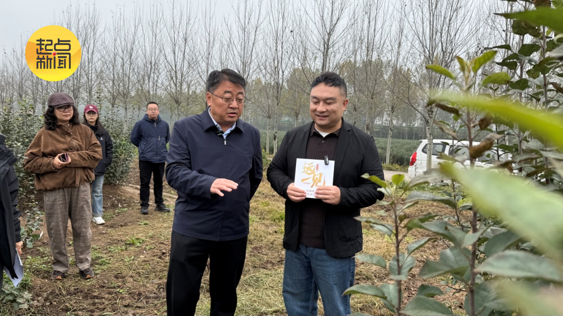 千陽縣農業農村局局長楊紅忠(前左一)與主持人靳博行進直播介紹千陽蘋果苗木產業