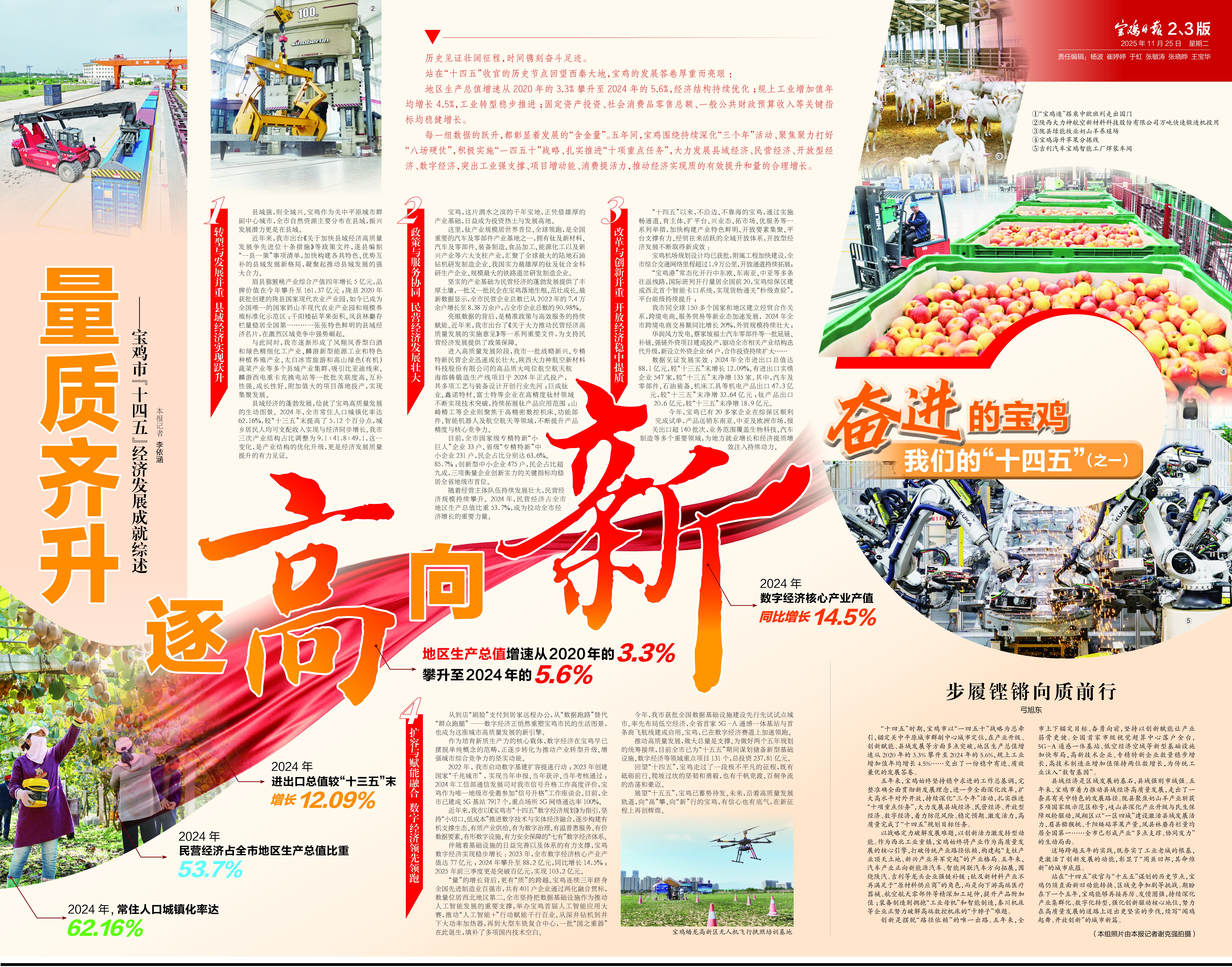 “十四五”時期,寶雞市以“一四五十”戰略為總牽引,錨定關中平原城市群副中心城市定位,在產業升級、創新賦能、縣域發展等方面多點突破,地區生產總值增速從2020年的3.3%攀升至2024年的5.6%,規上工業增加值年均增長4.5%……交出了一份穩中有進、質效兼優的發展答卷。