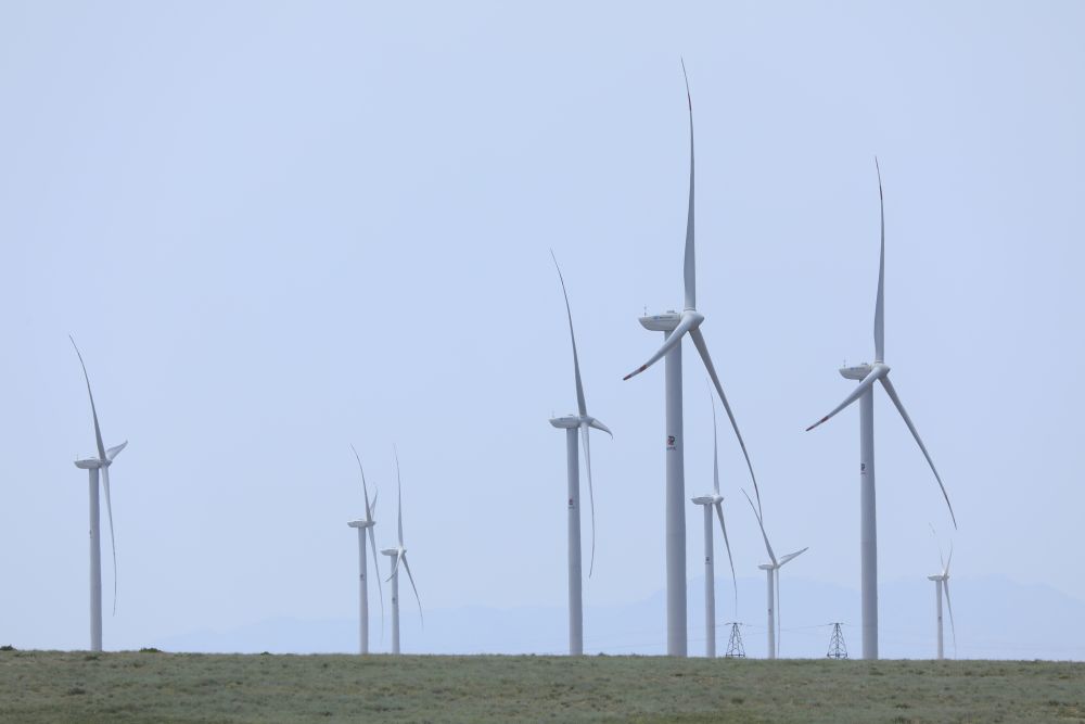 圖為2021年5月24日在哈薩克斯坦扎納塔斯拍攝的風電場的風機。新華社發(奧斯潘諾夫攝)