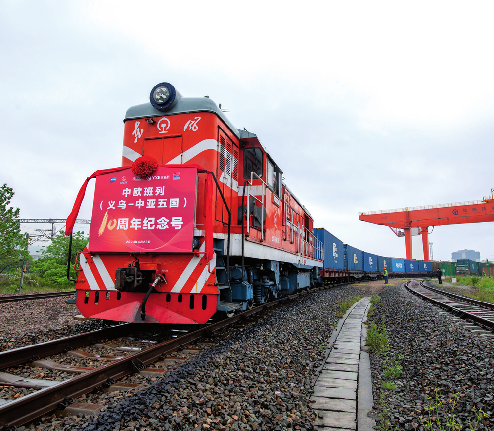 載有 100 標準箱貨物的“義烏-中亞五國 10 周年紀念號”中歐班列在義烏西站鳴笛啟程,前往中亞五國(2023 年 4 月 23 日攝)胡肖飛攝 / 本刊