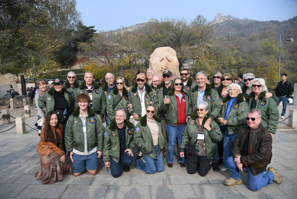 10月29日,飛虎隊老兵莫耶一行人在北京八達嶺長城合影留念。當日,美中航空遺產基金會訪華代表團成員陸續抵達北京。新華社記者 任超 攝