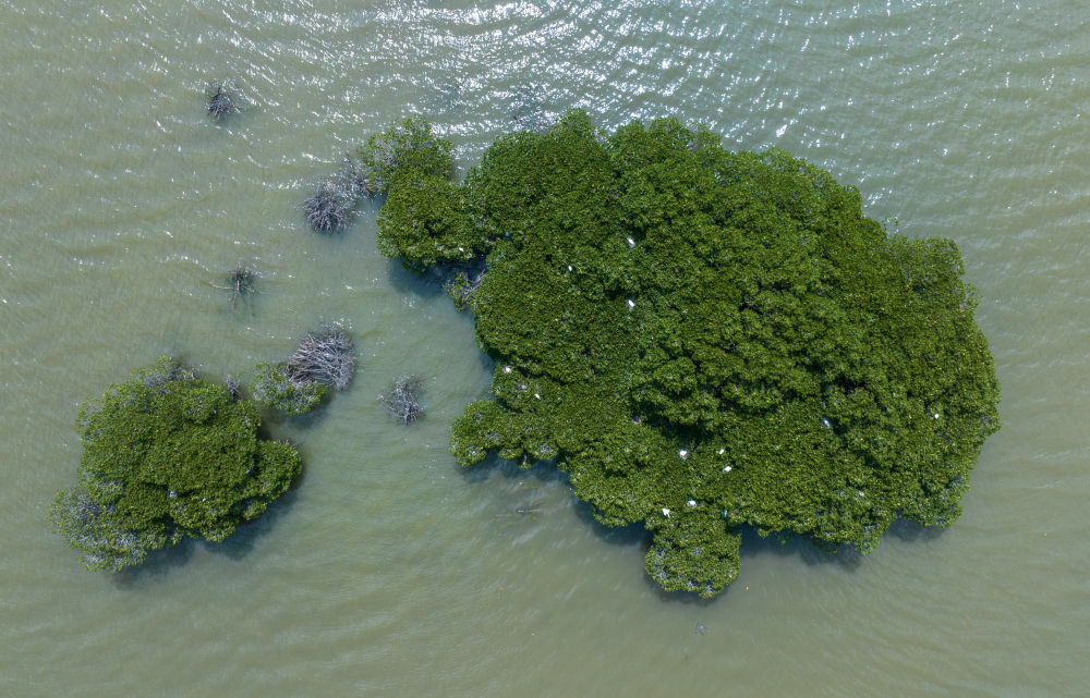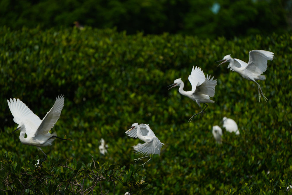 鷺鳥在廣東湛江金牛島的紅樹林上棲息(2024年5月17日攝,無人機照片)。廣東湛江紅樹林國家級自然保護區,是中國面積最大、分布最集中的紅樹林自然保護區,是世界濕地生態恢復的成功范例。
