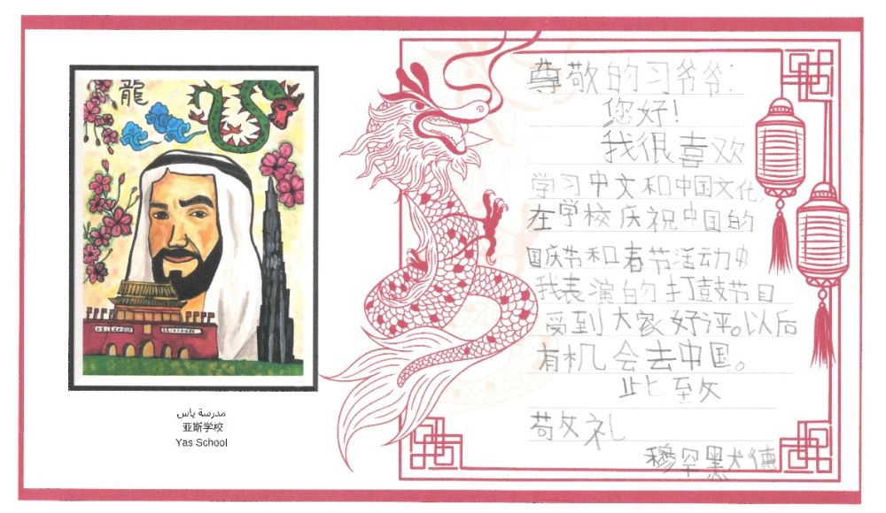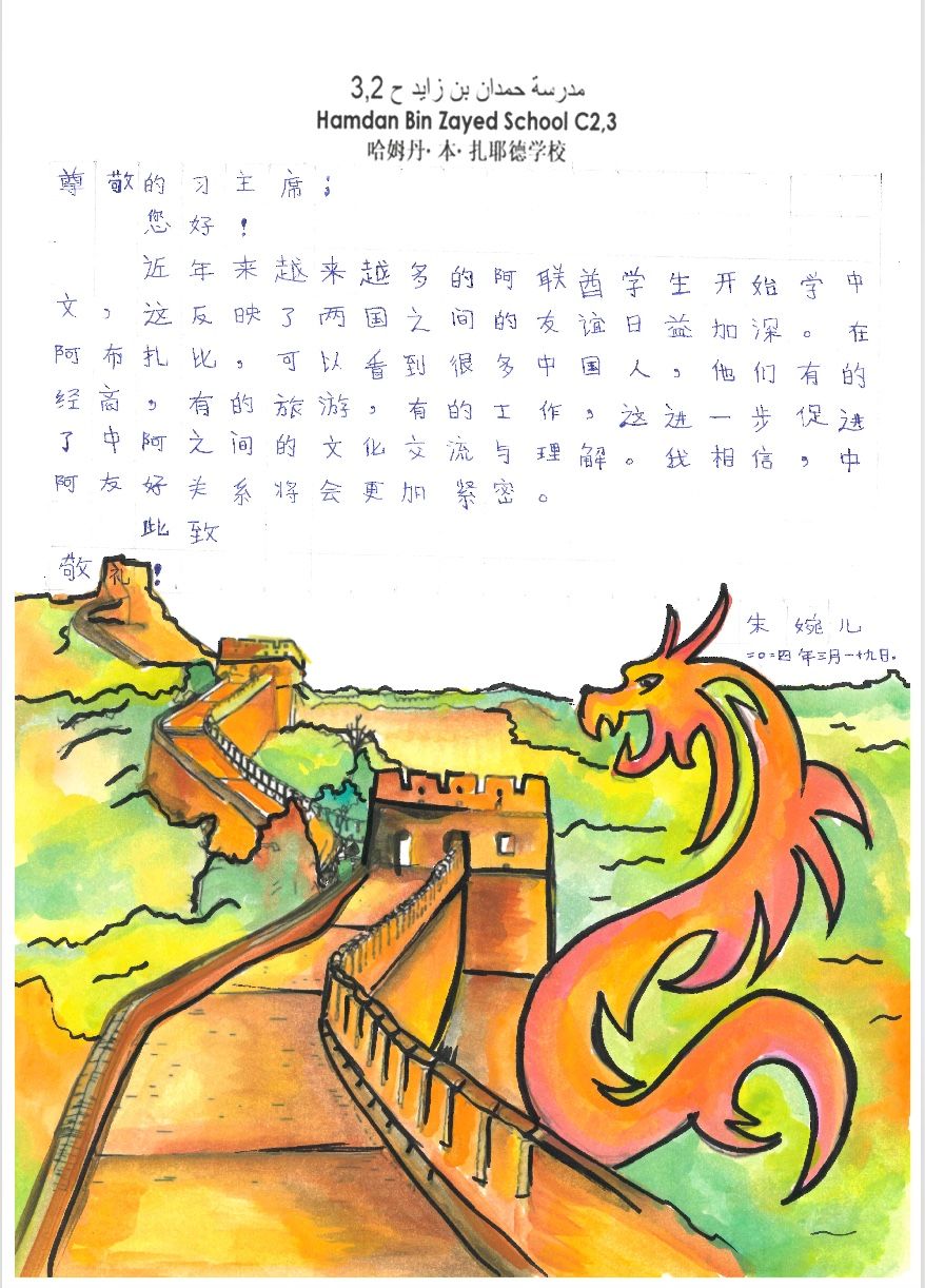 中文名叫“朱婉兒”的12年級學生朱韋雷婭在信中畫下龍與長城,她說如今學中文的阿聯酋學生越來越多,“相信中阿友好關系將會更加緊密”。