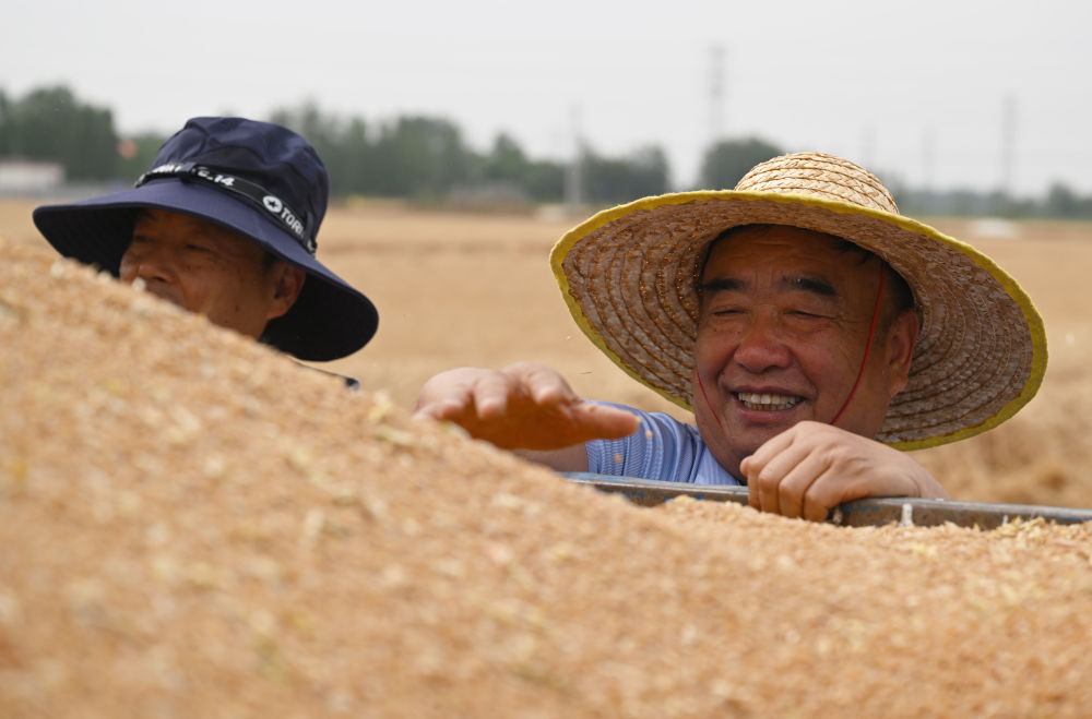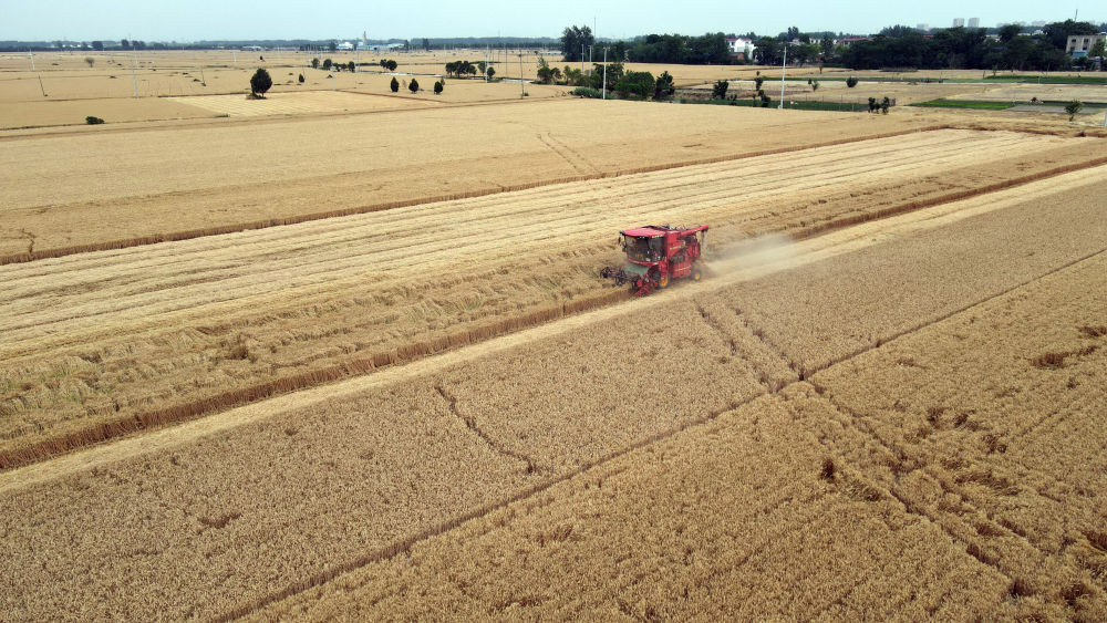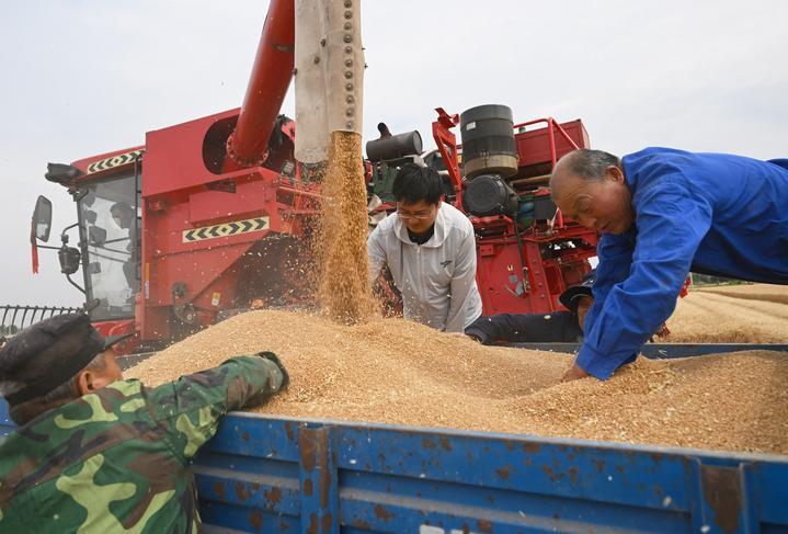 麥?zhǔn)諘r(shí)節(jié),在安徽阜陽太和縣,機(jī)器轟鳴,麥浪翻滾如金色綢緞,飽滿的麥粒裝滿一輛輛運(yùn)糧車的貨廂。