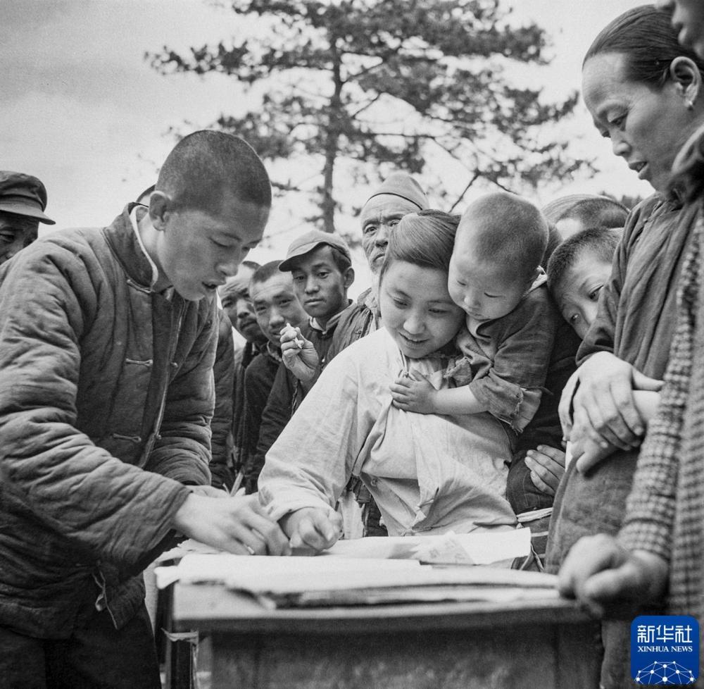 1952年10月,亞太地區和平大會在北京召開前夕,北京郊區八里莊農民簽名呼吁和平。新華社記者 葛力群 攝