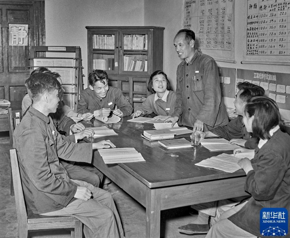 1954年,在中國人民大學工業經濟系進修的老工人、勞動模范薛吉瑞(站立者)在學校組織的學習《中華人民共和國憲法草案》小組會上發言。 新華社記者 毛松友 攝