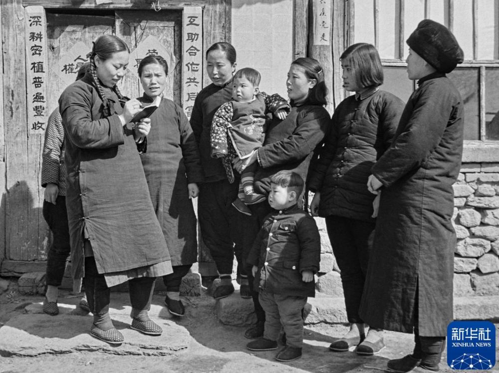 1954年,當選人民代表的遼西省義縣(今遼寧義縣)大鐵廠村第二農業生產合作社婦女生產隊長喬淑春(左)征求鄉親們對農業生產的意見和要求。新華社記者 胡偉 攝
