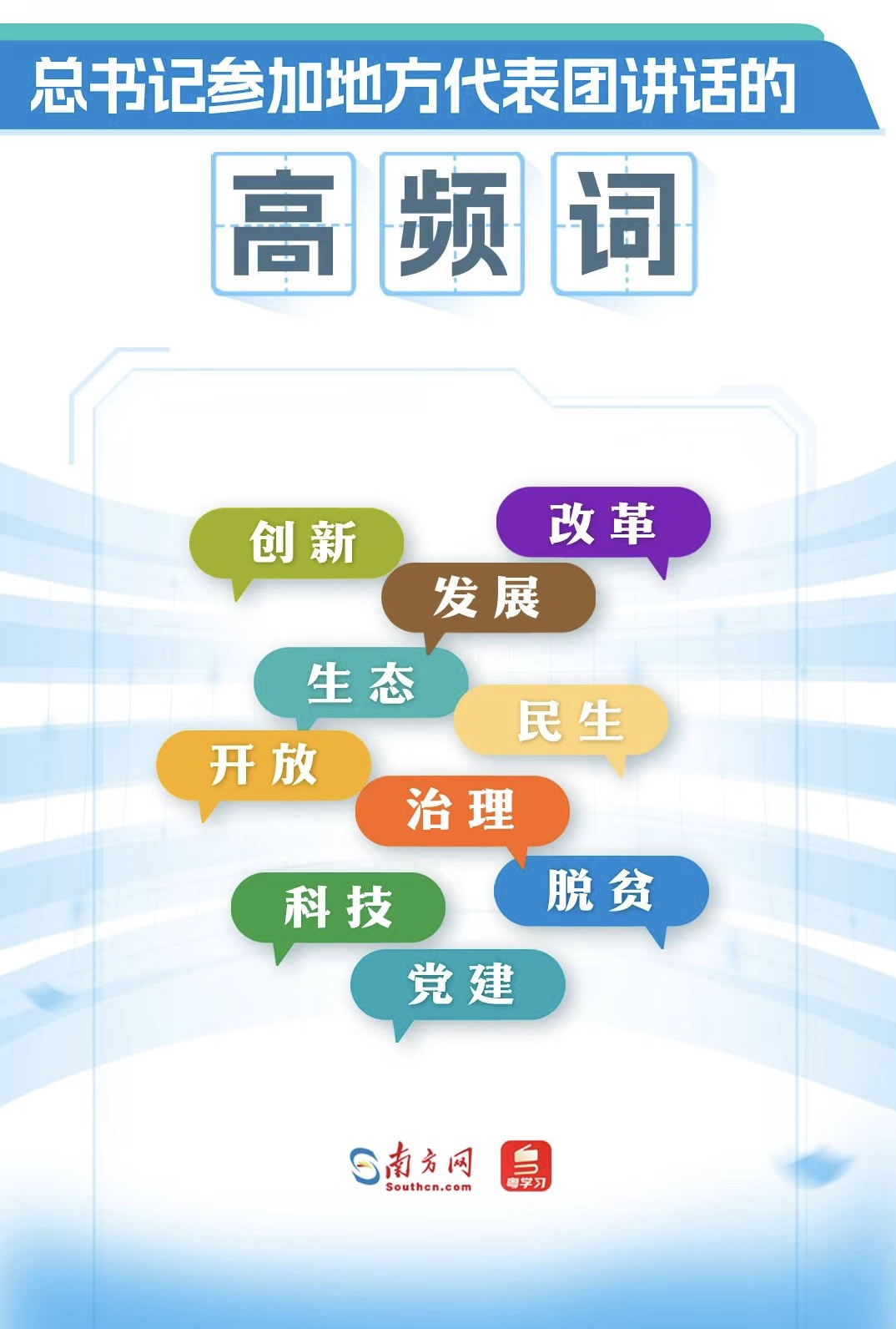 13年36次參加地方代表團審議,習(xí)近平總書記的講話里,有哪些高頻詞?從詞云圖中,“創(chuàng)新”“改革”“發(fā)展”“生態(tài)”“民生”“開放”“治理”“脫貧”“科技”“黨建”等詞語引人注目,反映了總書記的關(guān)注點。