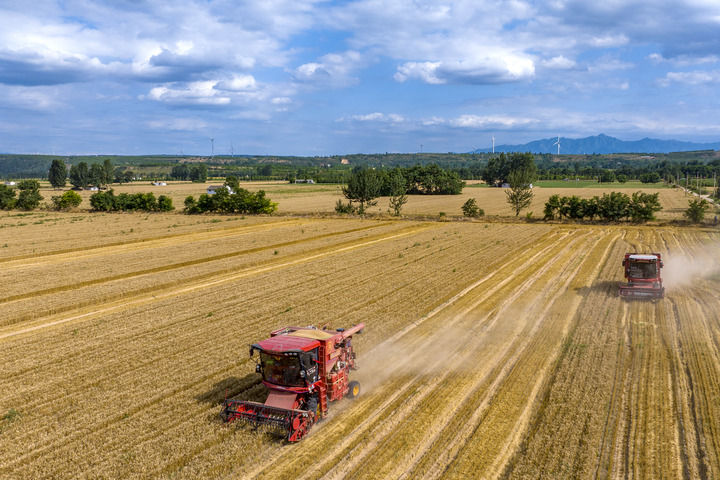 2024年6月5日,收割機在河南三門峽靈寶市的麥田里收獲小麥。新華社發(杜杰 攝)