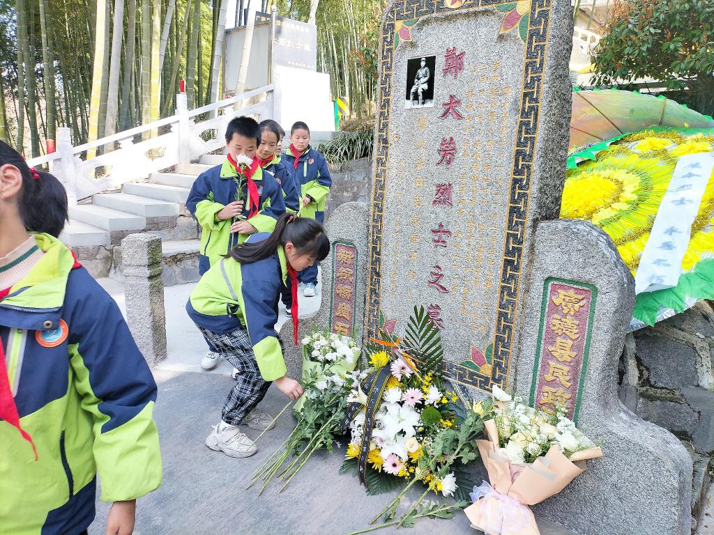 學生在鄭大芳烈士墓前敬獻鮮花。(受訪單位供圖)