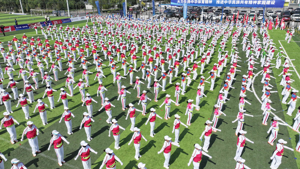 2025年6月10日,群眾在寧夏銀川市金鳳區(qū)覽山公園參加千人健身操展演(無人機(jī)照片)。當(dāng)日,紀(jì)念“發(fā)展體育運(yùn)動(dòng) 增強(qiáng)人民體質(zhì)”題詞73周年全民健身主題活動(dòng)在覽山公園舉行。