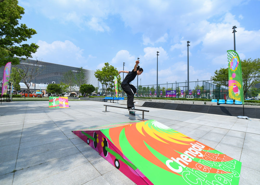 2023年4月19日,體育愛好者在四川成都東安湖體育公園練習滑板。