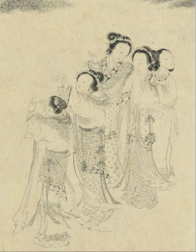 這幅清代的《月曼清游圖》繪了十名女子,她們正聚集在桐蔭下,圍著看一碗水,就是七夕習俗里的投針驗巧。
