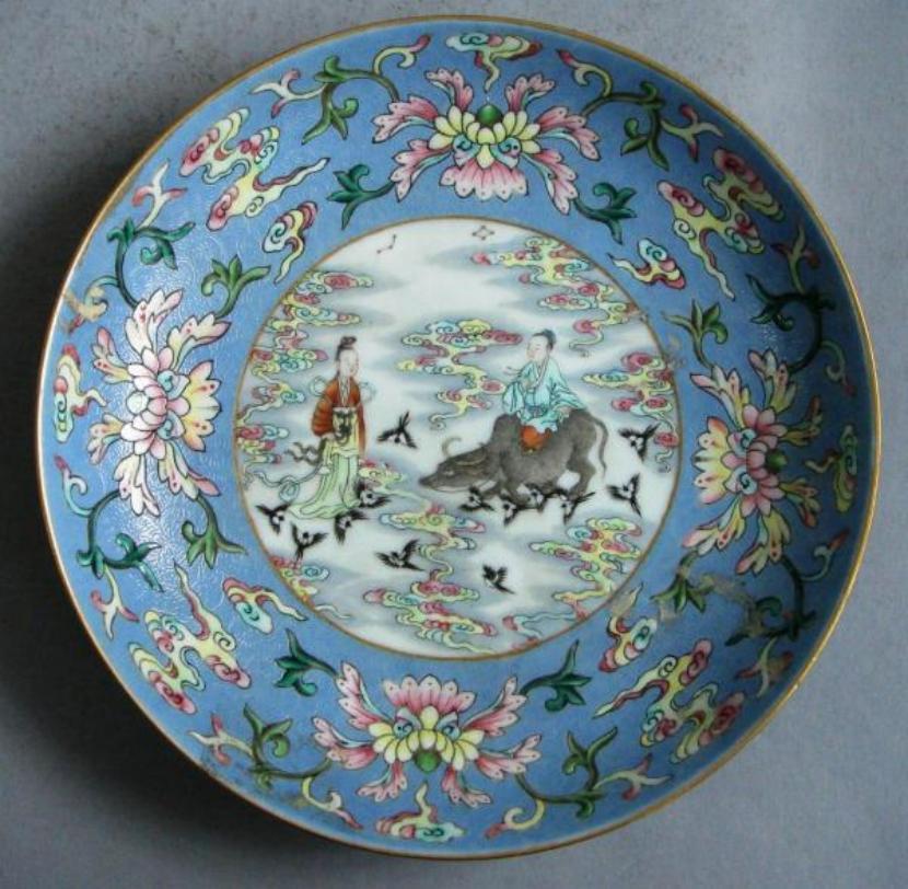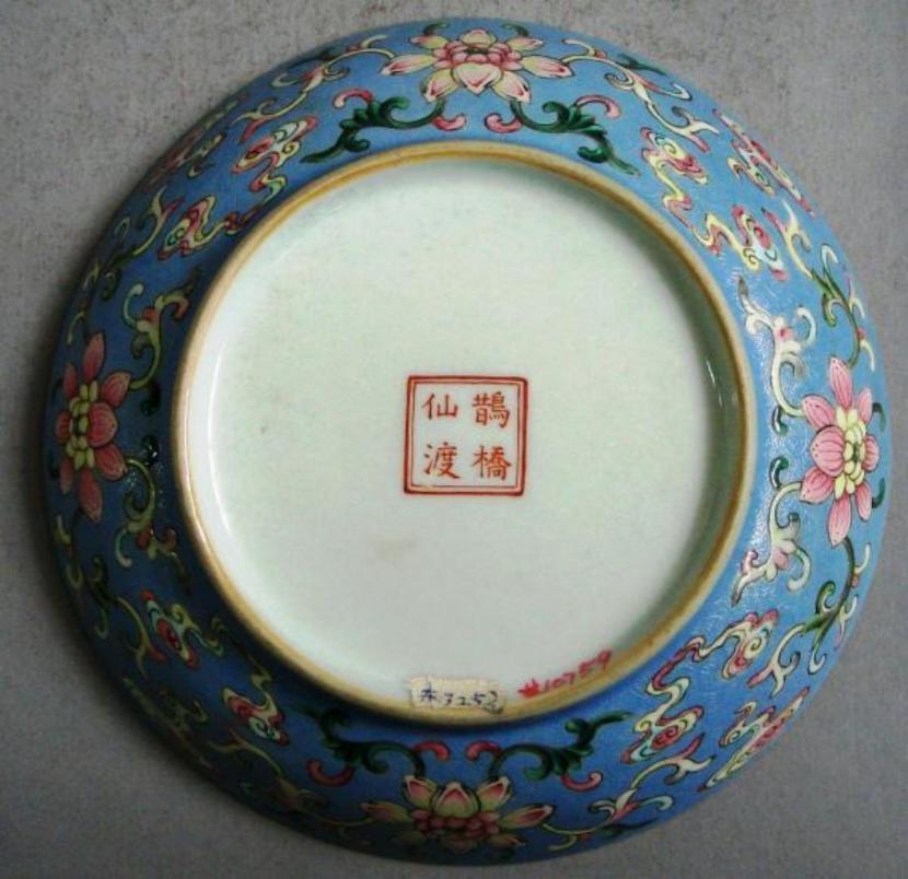 這一清代景德鎮官窯制作的粉彩人物圖盤,盤底書紅彩“鵲橋仙渡”,盤中一青年男子,坐于牛背之上,手握韁繩,似在與左方的女子互訴衷腸。背景襯托著祥云、星辰與鵲鳥。
