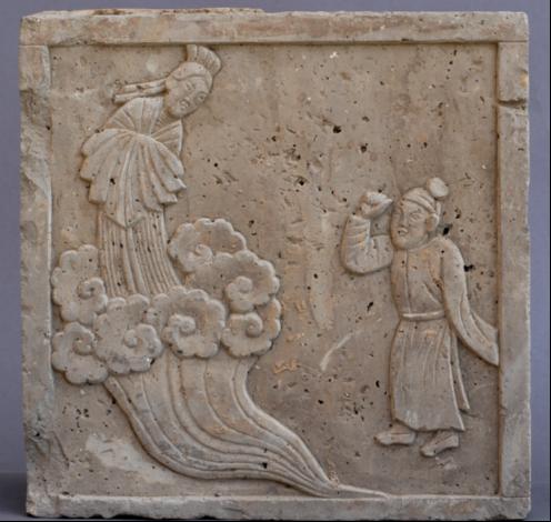 宋代的董永七仙女雕磚,畫面右側站立一男子,身著長袍,左手下垂,右手置于額部,左下一朵祥云,上站立一仙女。