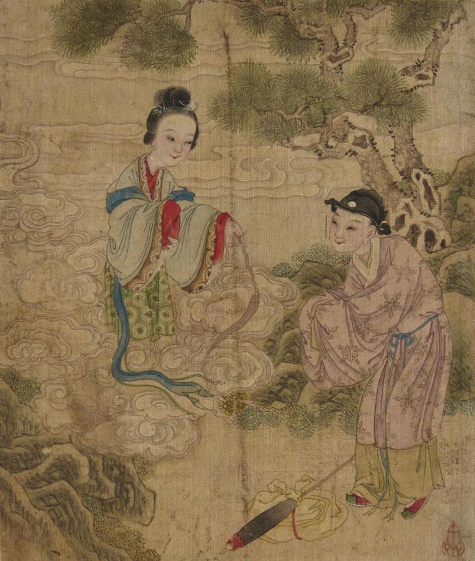 此圖頁為仇英繪制的董永賣身葬父片段。圖中女子立于祥云之上,以一月時間織成三百匹錦緞,為董永抵債贖身。