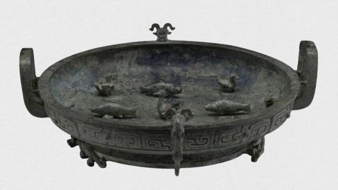 “春秋子仲姜盤”高 18 厘米,口徑 45 厘米,重 12.4 千克,盤內裝飾了浮雕和立雕的各種水生生物,魚、龜、蛙、水鳥一應俱全,每個圓雕動物均能原地作平面 360 度的旋轉。是 2600 多年前晉國太師送給妻子仲姜的一個禮物,當水注入其中時,里面的水鳥、魚、青蛙等小動物就會動起來,靈動而可愛。