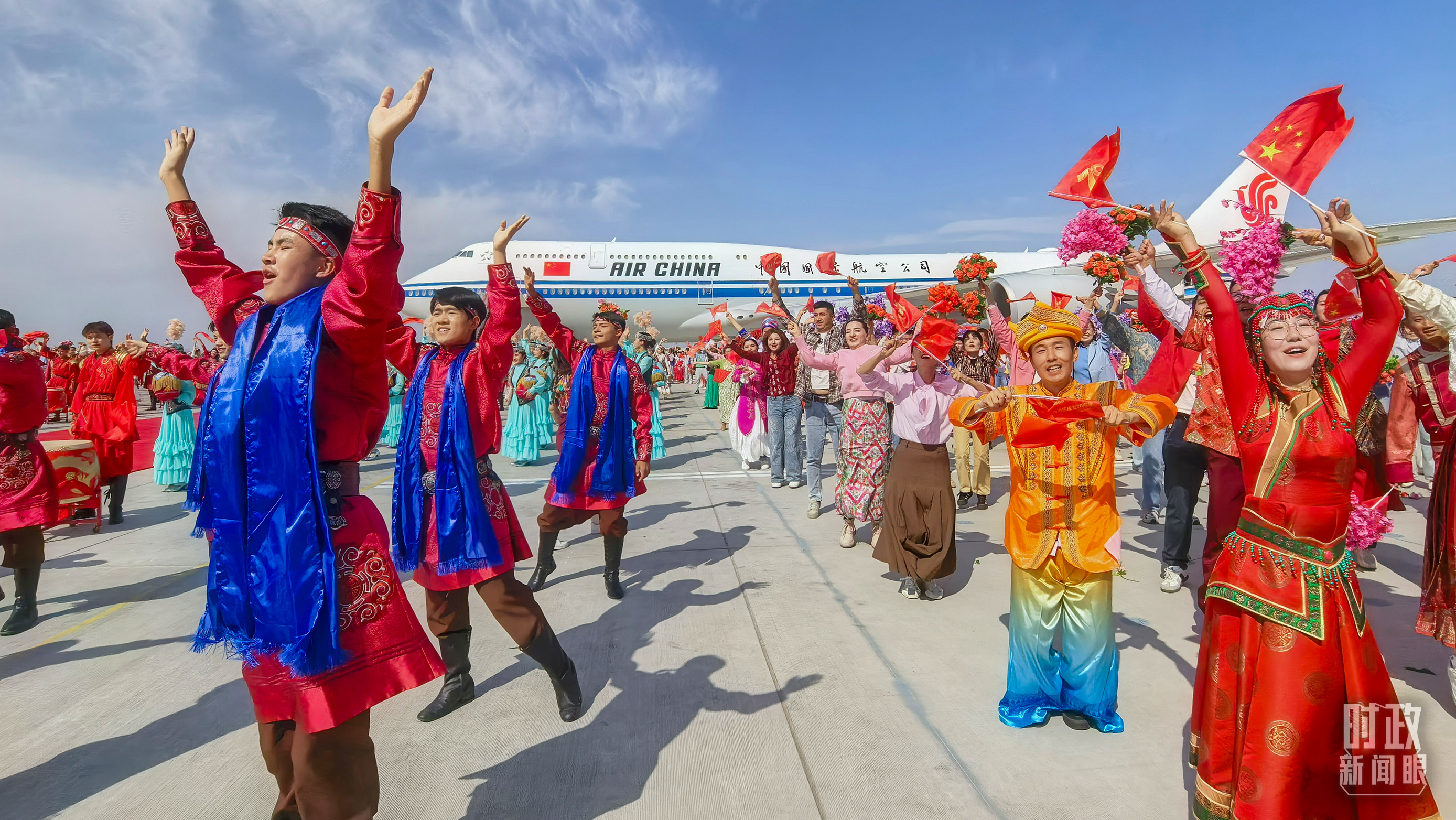 23日下午,烏魯木齊天山國際機場鼓樂喧天。總書記乘坐的專機在機場降落,等候在停機坪的新疆各族各界群眾熱烈歡呼。