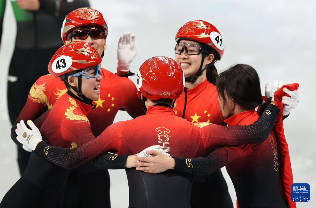 ??2022年2月5日,在首都體育館舉行的北京2022年冬奧會短道速滑項目混合團體接力決賽中,中國隊奪得冠軍。這是中國隊選手在比賽后慶祝。新華社記者 楊磊 攝