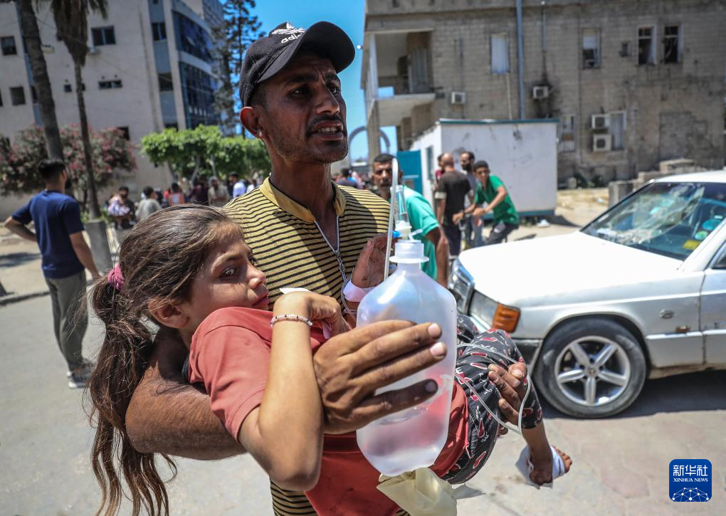 ??2025年7月13日,在加沙城一所醫院,一名男子懷抱在以軍空襲中受傷的女孩。新華社發(馬哈茂德·扎基攝)