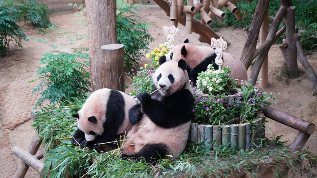 ??2025年7月7日,在韓國京畿道龍仁市愛寶樂園,大熊貓媽媽“愛寶”(中)和“睿寶”、“輝寶”在慶生活動上享用美食。新華社發(孫一然攝)