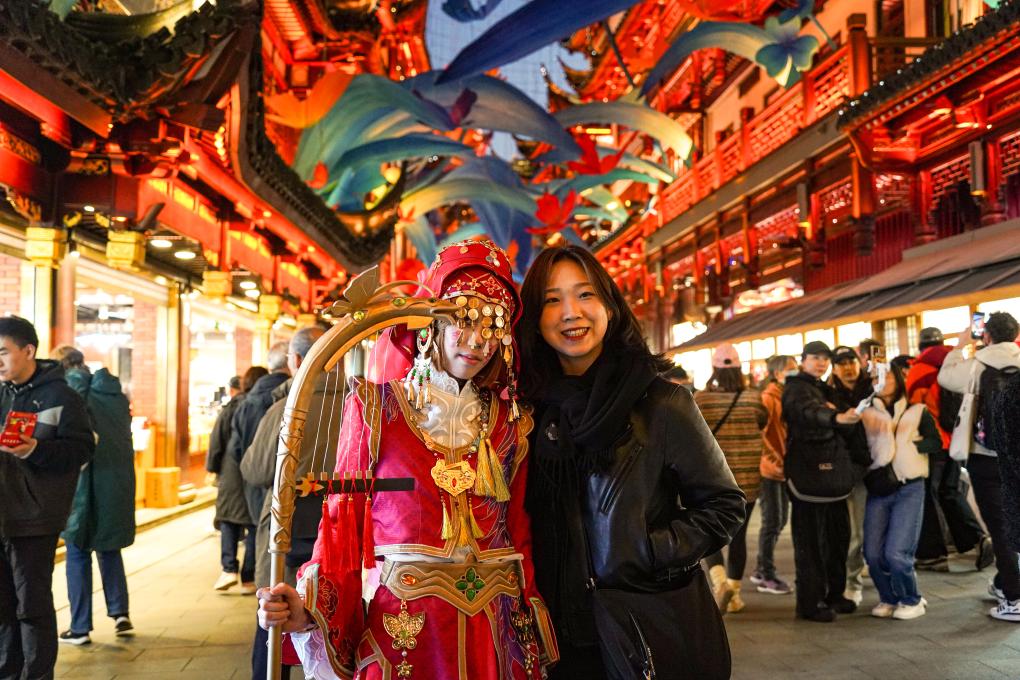 ??2024年11月30日,來自韓國的游客(右)在上海豫園商城與游戲角色裝扮者合影。新華社發(謝鑫攝)