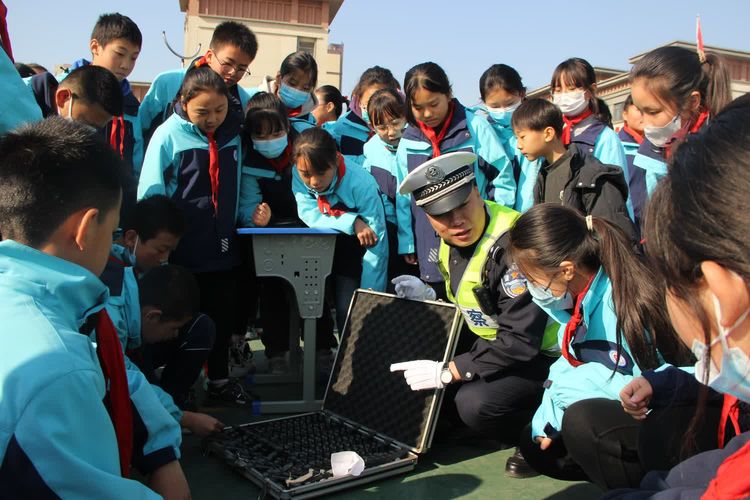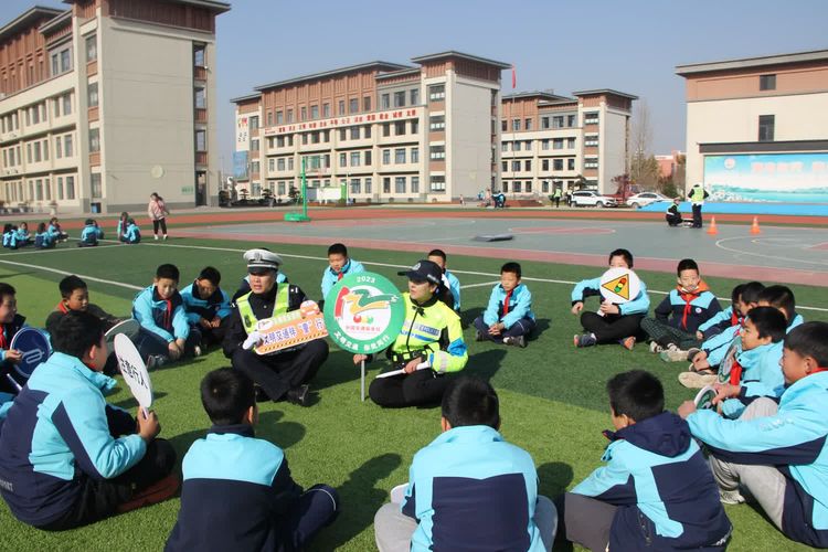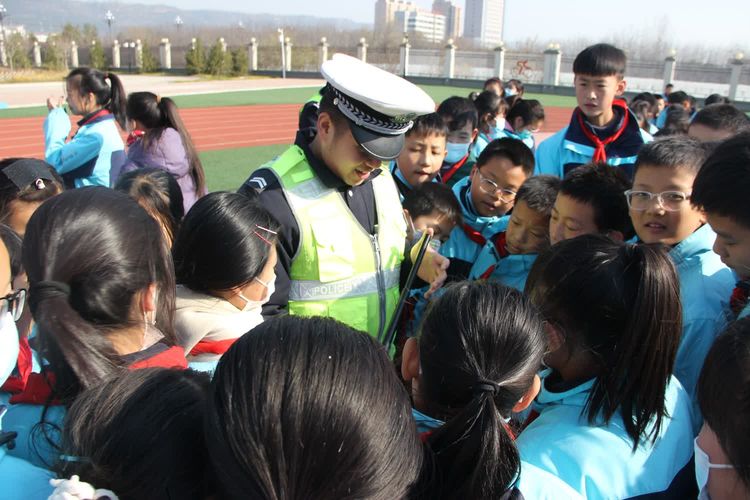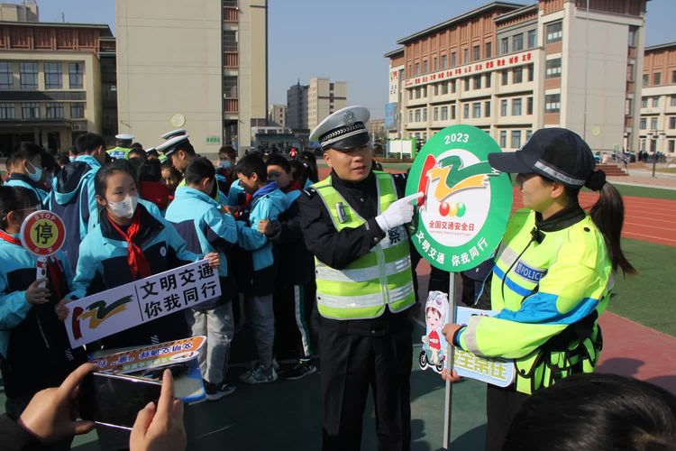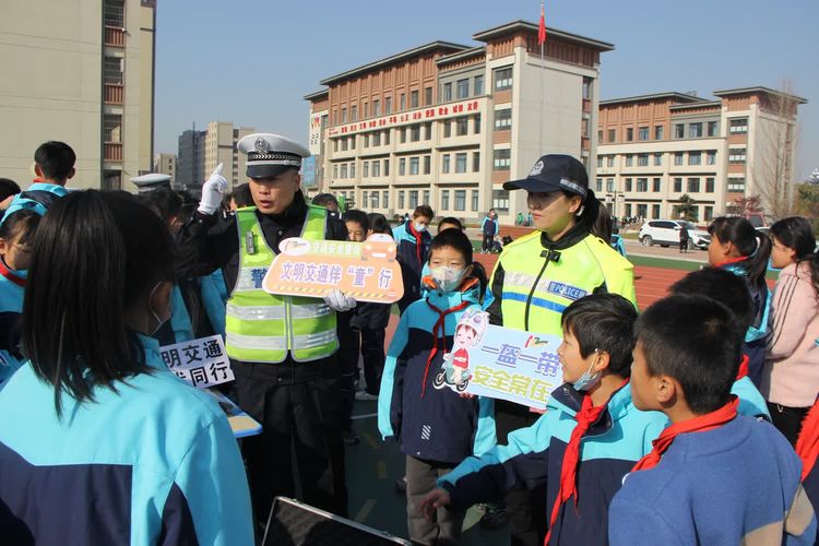 在學校操場,宣傳民警通過日常工作介紹、認識交通標志、部分警用裝備展示等,讓學生們切身感受到交通安全就在自己身邊,從而讓學生們提高學習安全知識的積極性,養成文明交通出行意識和習慣。