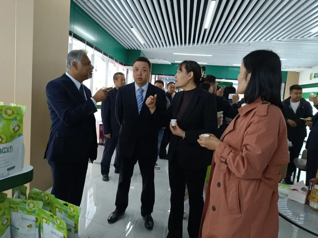 眉縣農業農村局組織齊峰果業、金橋果業、美源果品、齊齊果業、千裕酒業、百澤異美園等12家果業企業入駐寶雞綜合保稅區,設置眉縣獼猴桃展廳,全方位展示眉縣獼猴桃新品種、果汁、果脯和包裝品。會議結束后,市政府副市長佘俊臣一行來到眉縣獼猴桃展廳參觀品鑒,斯里蘭卡外商同果業企業負責人進行深入交流,互留聯系方式,并達成初步合作意向。