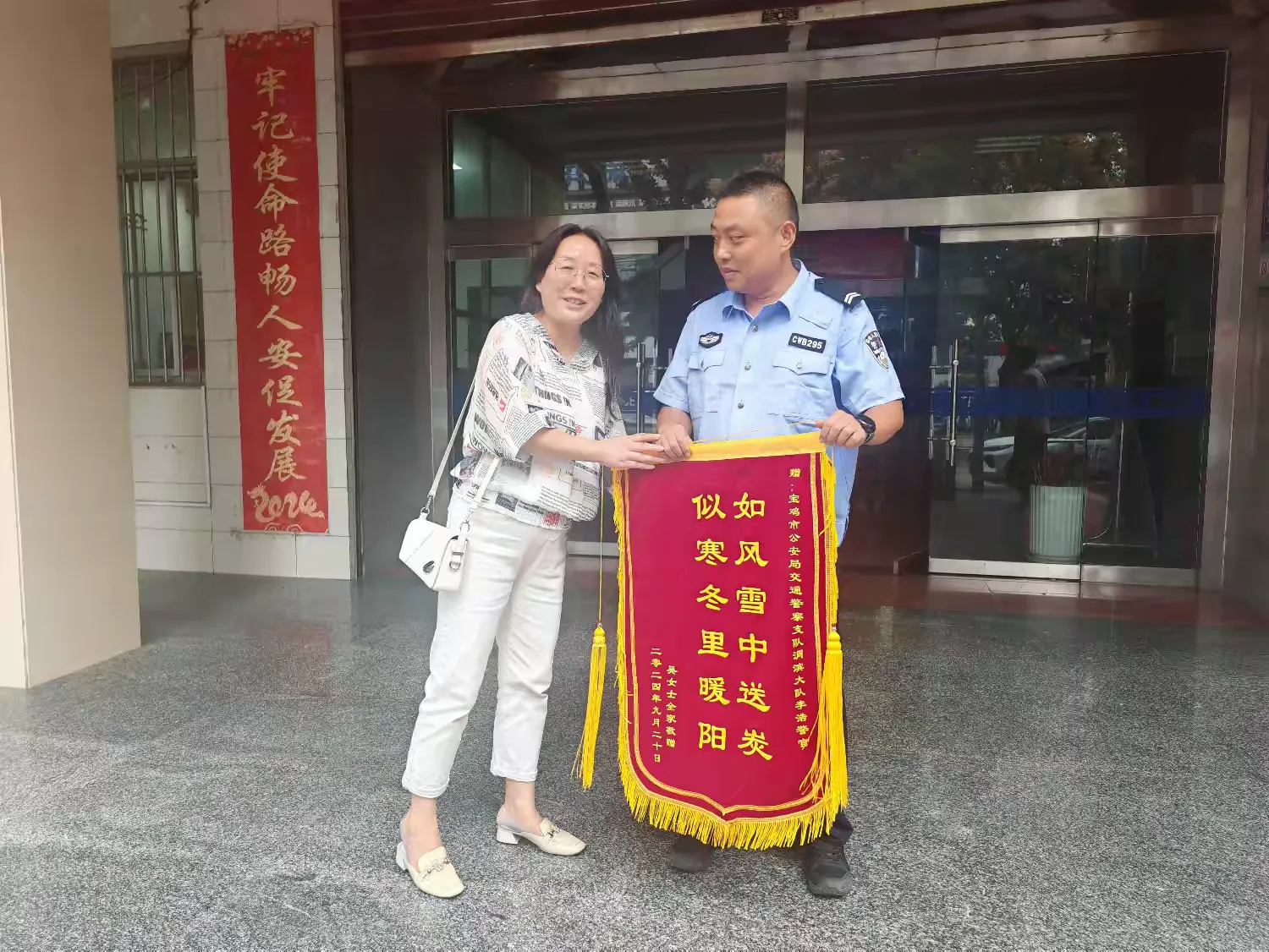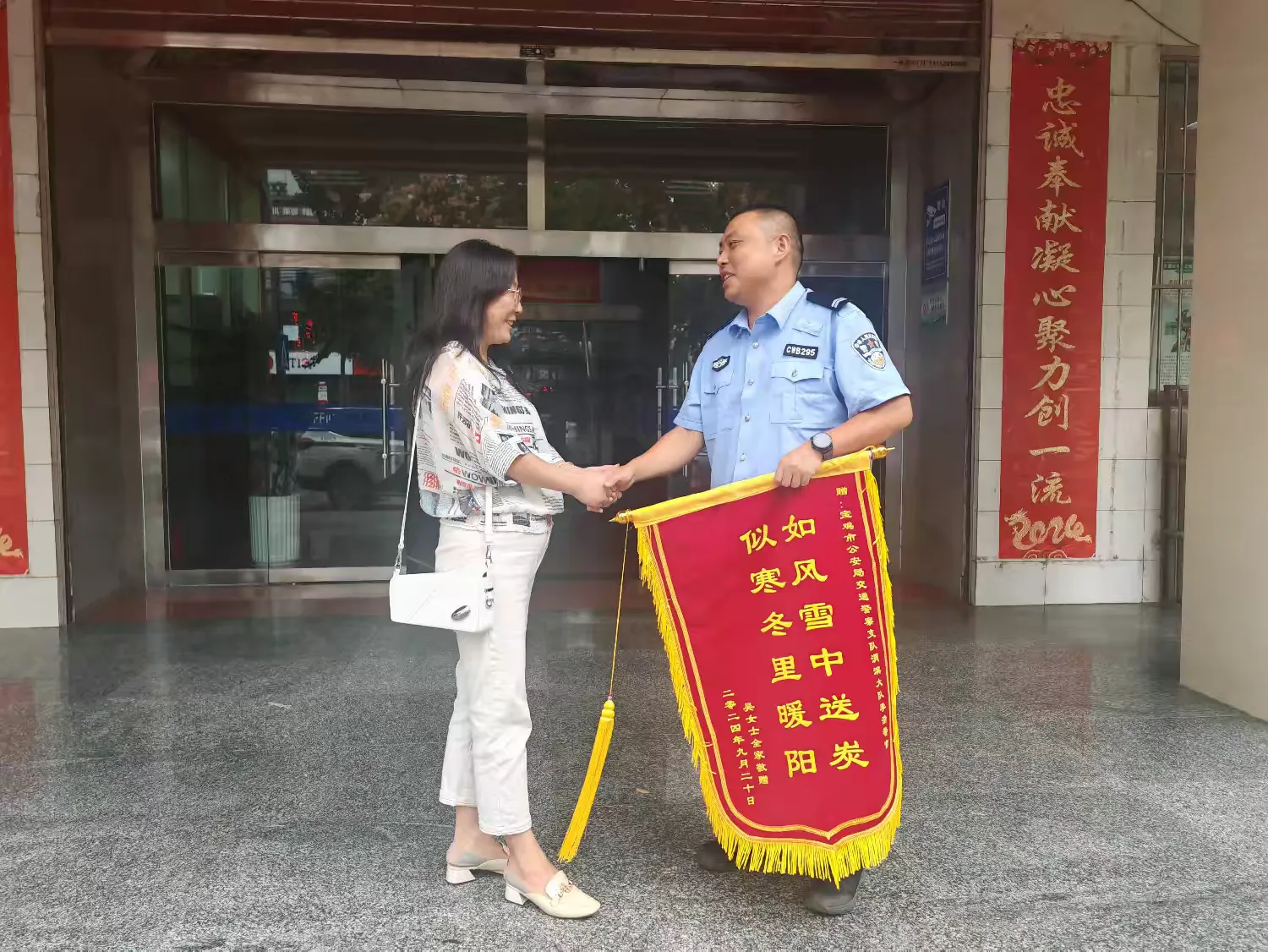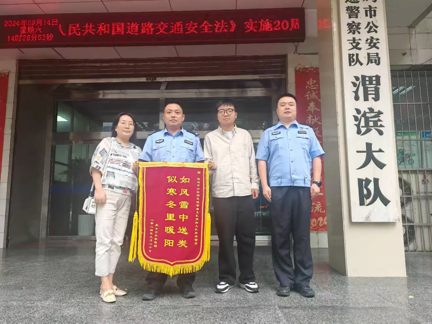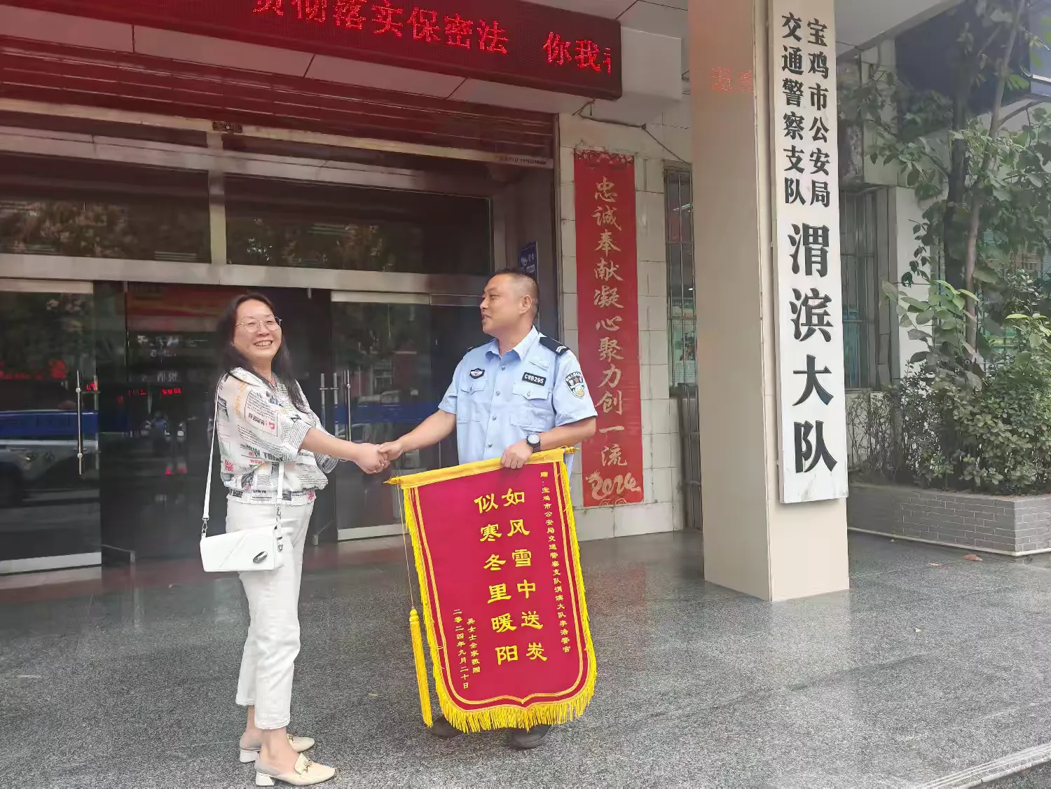 9月20日,一位群眾來到渭濱交警大隊,將一面印有“如風雪中送炭,似寒風里暖陽”的錦旗,送到鐵騎分隊民警李浩手中,以表達對執勤交警緊急護送其家中老人及時就醫的感激之情。
