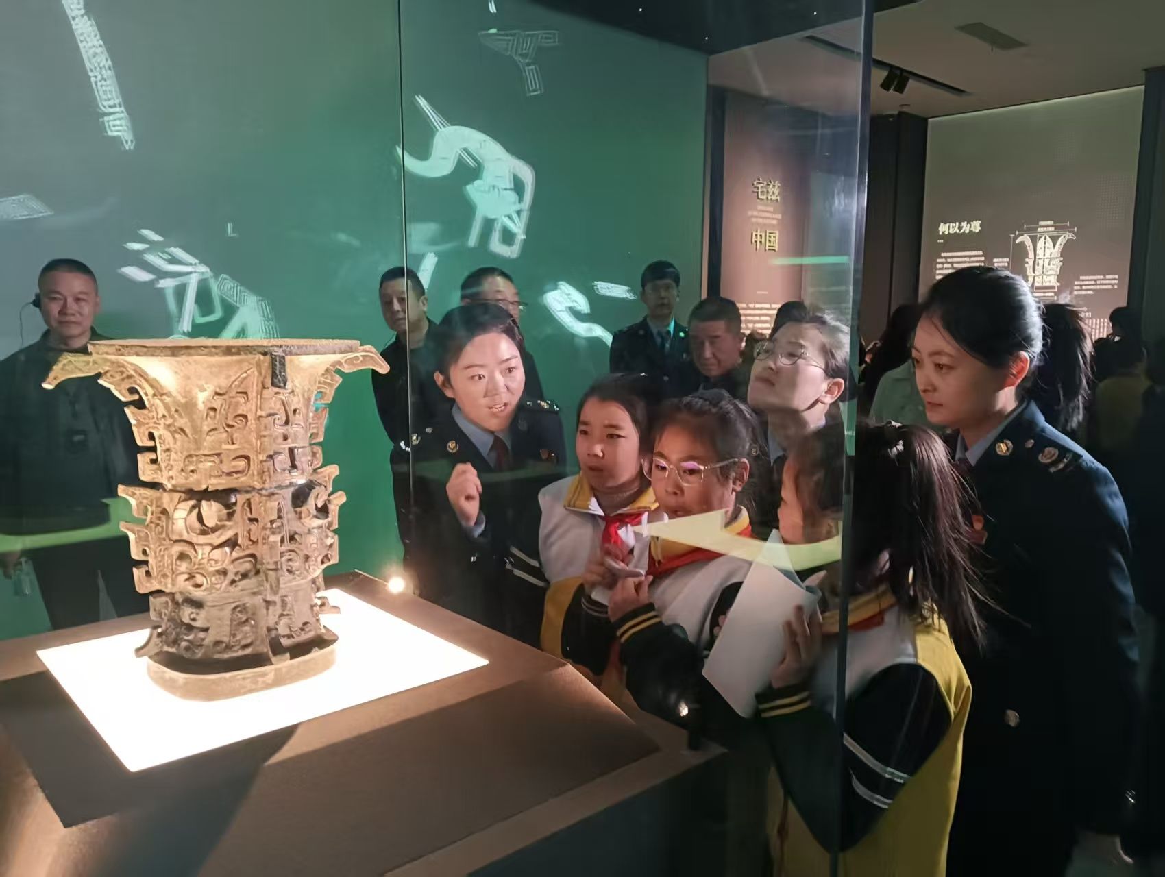 在逨鼎前,稅務干部從其上銘文“雩乃敷政事,勿敢不規不型”講起,向孩子們闡述了中國古代公正用權,嚴以用權的精神。