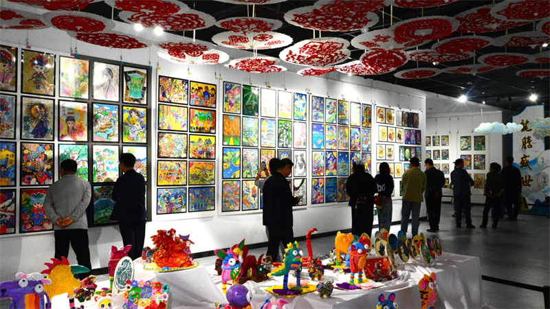 在群眾藝術(shù)館的美術(shù)展現(xiàn)場,彩繪《龍騰盛世》以濃烈的筆觸勾勒出巨龍騰飛的磅礴氣勢,金紅相間的色調(diào)在燈光下熠熠生輝;剪紙吊傘系列將傳統(tǒng)工藝與現(xiàn)代設(shè)計巧妙融合;兒童創(chuàng)意畫《未來城市》展現(xiàn)了天馬行空的想象力,用大膽的色塊和線條描繪未來科技生活;書法《蘭亭集序》臨摹筆法精妙,行云流水間盡顯魏晉風(fēng)骨;青銅器紋樣創(chuàng)新作品成為全場焦點,學(xué)生們將西周青銅紋飾與現(xiàn)代插畫技法完美結(jié)合。