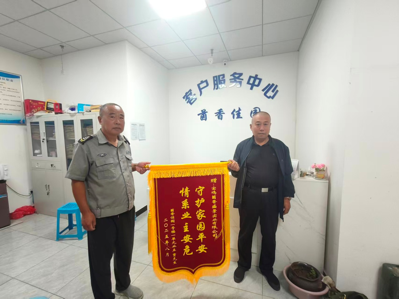 近日,寶雞茵香佳園(安置小區(qū))住戶賈先生專程將一面寫有“守護(hù)家園平安情系業(yè)主安危”的錦旗送到小區(qū)物業(yè)公司,以此感謝保安崔偉深夜及時(shí)撲滅摩托車火情,成功守護(hù)居民生命財(cái)產(chǎn)安全的英勇行為。