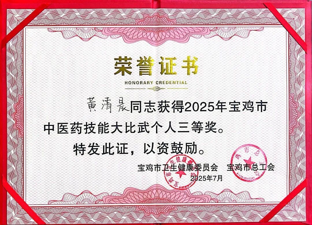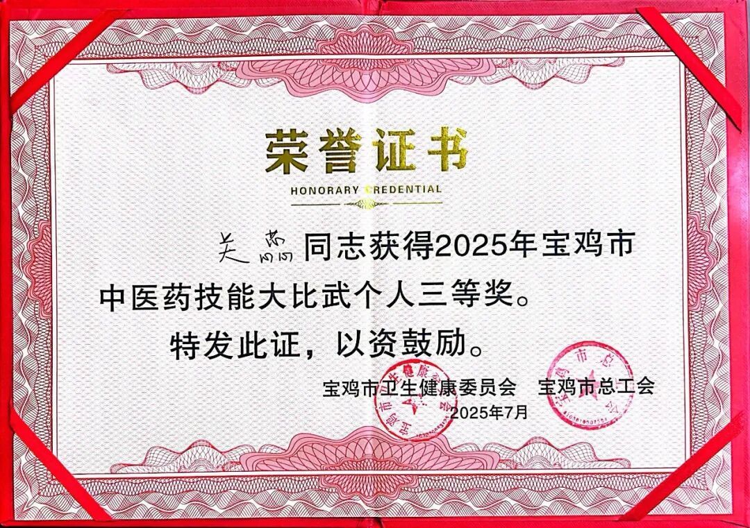 7月4日,由市衛生健康委、市總工會主辦的2025年寶雞市中醫藥技能大比武火熱開賽。來自全市各縣區及委直委管醫療機構的22支代表隊、66名中醫藥精英同場競技。寶雞市婦幼保健院代表隊憑借扎實的專業功底和出色的現場發揮,斬獲團體二等獎,關蕊、黃清晨分別榮獲個人三等獎,充分展現了醫院中醫藥人才隊伍的卓越風采。