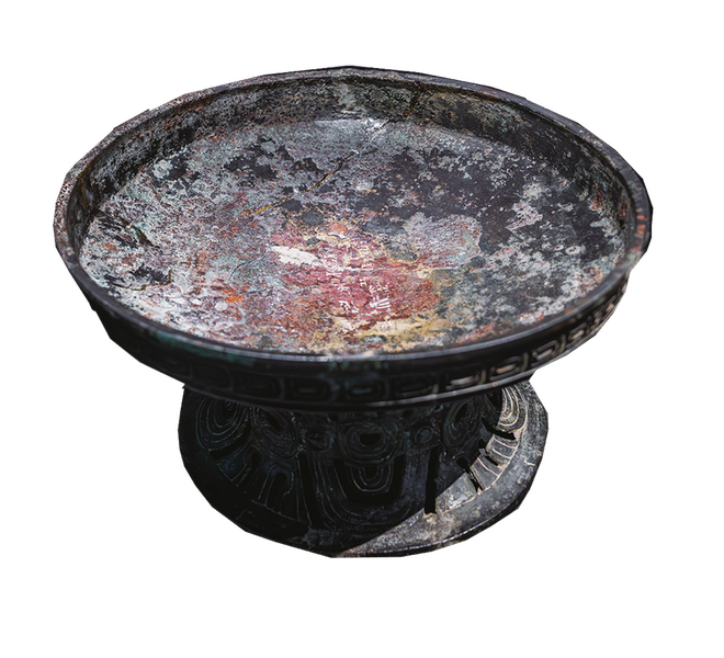 事實上,不是所有的簠都具有器蓋同形的特點。藏于寶雞周原博物院的微伯(疒興xing)簠,是1976年出土于扶風縣莊白一號窖藏的西周中期器物,它高14.5厘米、盤徑17.8厘米。器物整體看起來如食器豆的外形,但柄極粗,直口方唇,沿微外折,圈足束腰,中有一道箍棱,下部外侈,以達到與盤平衡的效果。盤外壁飾有一周重環紋,圈足飾有透雕的夔龍紋和環帶紋。寶雞周原博物院工作人員權瑞雪告訴記者,這種高柄盤形器是一種盛食器,多數沒有銘文,過去都把它們歸入豆類,稱作鏤空柄豆。有學者認為它是典籍中所載的“籩(biān)”,用來放置干果和干肉,看起來格外精美。