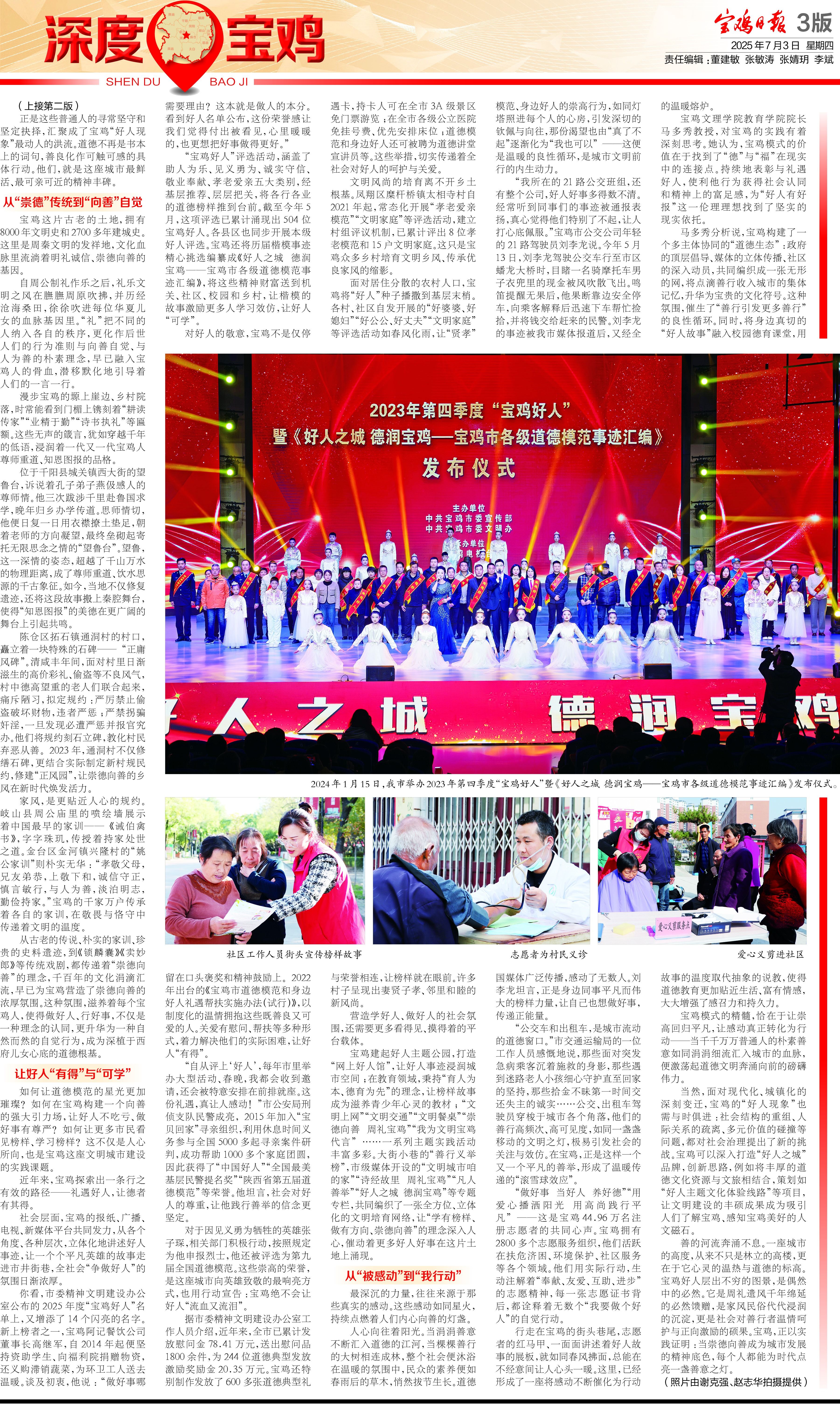 “寶雞好人”評(píng)選活動(dòng),涵蓋了助人為樂(lè)、見義勇為、誠(chéng)實(shí)守信、敬業(yè)奉獻(xiàn)、孝老愛親五大類別,經(jīng)基層推薦、層層把關(guān),將各行各業(yè)的道德榜樣推到臺(tái)前。截至今年5月,這項(xiàng)評(píng)選已累計(jì)涌現(xiàn)出504位寶雞好人。各縣區(qū)也同步開展本級(jí)好人評(píng)選。寶雞還將歷屆楷模事跡精心挑選編纂成《好人之城 德潤(rùn)寶雞——寶雞市各級(jí)道德模范事跡匯編》,將這些精神財(cái)富送到機(jī)關(guān)、社區(qū)、校園和鄉(xiāng)村,讓楷模的故事激勵(lì)更多人學(xué)習(xí)效仿,讓好人“可學(xué)”。