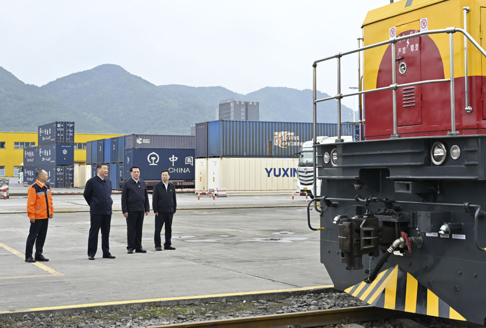 4月22日至24日,中共中央總書記、國家主席、中央軍委主席習(xí)近平在重慶考察。這是22日下午,習(xí)近平在重慶國際物流樞紐園區(qū)重慶鐵路集裝箱中心站考察。新華社記者 岳月偉 攝