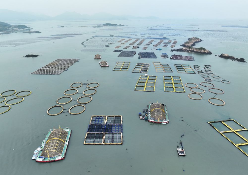 在福建連江定海灣海域,坐落著“定海灣1號”“定海灣2號”等深遠海養殖平臺(2024年5月7日攝,無人機照片)。新華社記者 林善傳 攝